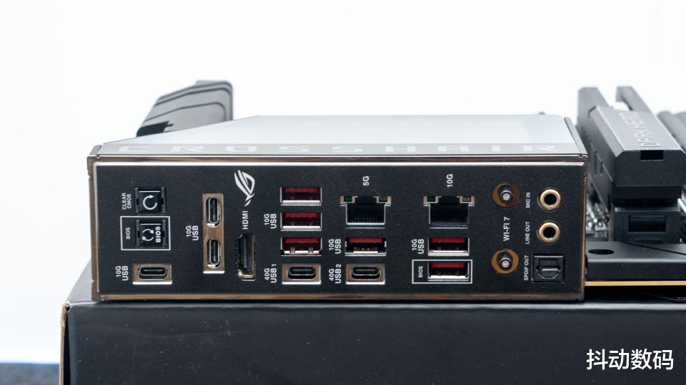 IO接口部分也是非常豪华,所有的USB-A接口都是红色的10Gbps设计,另外还提供了5个Type-C接口,两个Type-C接口为40G USB 4设计。另外还提供了两个有线网口,一个5G、一个10G都是战未来的设计,此外像是WiFi 7无线网卡自然也是标配了。