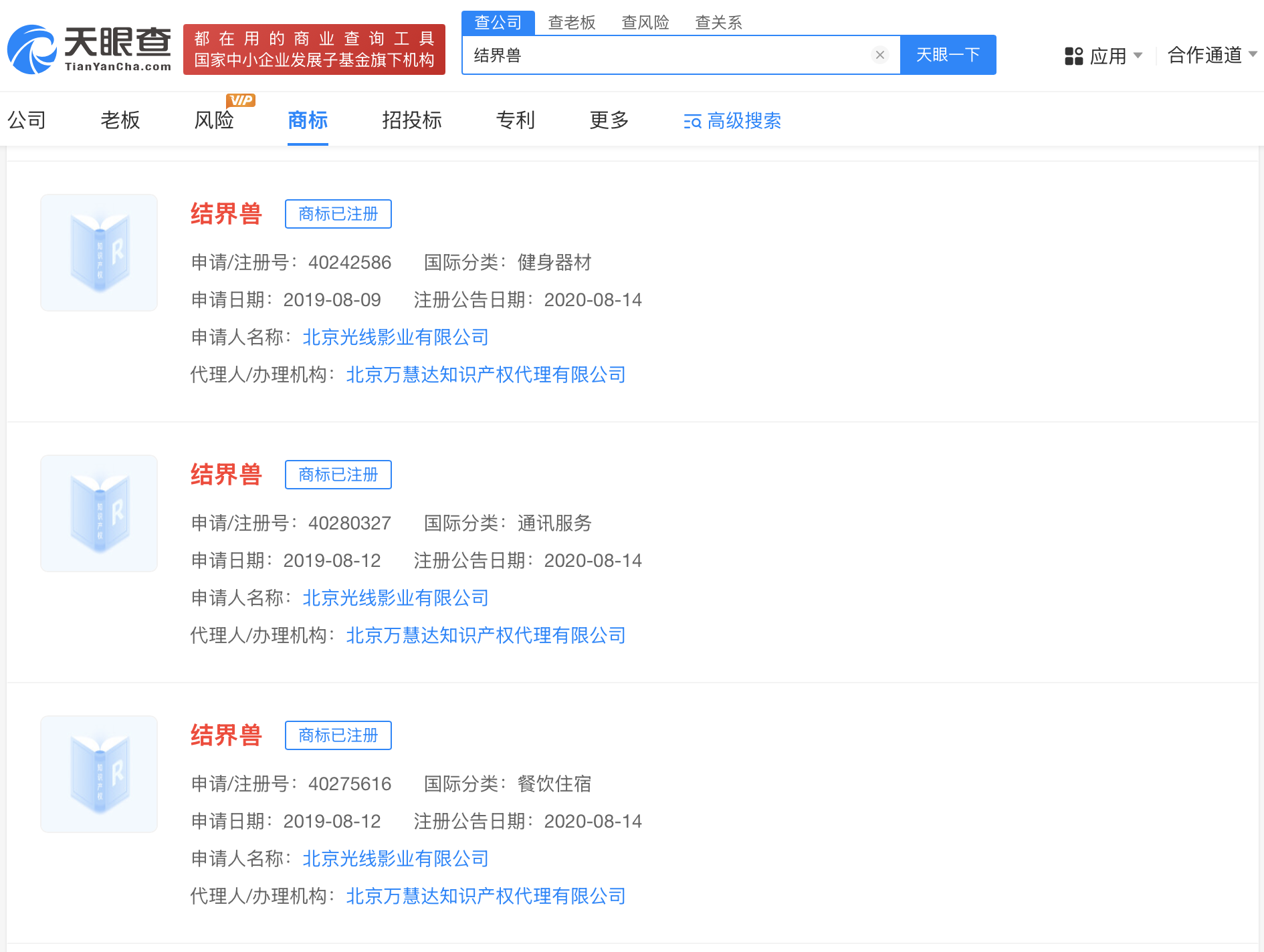 天眼查知识产权信息显示,北京光线影业有限公司已于2019年申请注册多枚“结界兽”商标,国际分类涉及健身器材、通讯服务等,商标状态多为已注册。