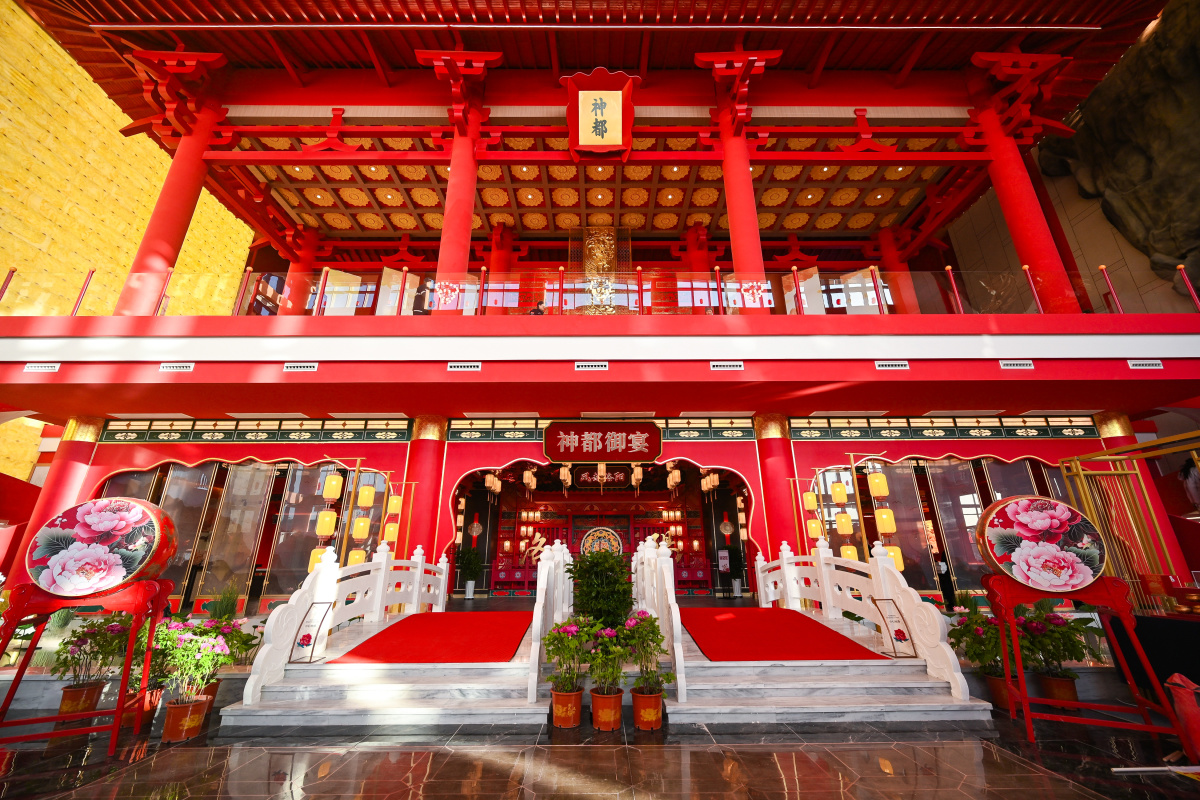 综合楼内一步一景,中央大殿复刻朝堂氛围,顶部七彩祥云层叠,光影交织满溢祥瑞,唐三彩与牡丹文化交相辉映,千年风雅流转于飞檐斗拱间。“龙椅卡位”汉服打卡让游客体验君临天下;司机之家淋浴、洗衣等设备一应俱全,服务细节尽显人文关怀;母婴室以牡丹主题软装打造,设置婴儿护理区,配备婴儿护理台、温奶器、净化器及应急母婴用品;“美食城”汇聚朴大叔、茶百道、库迪咖啡、道口烧鸡、绝味鸭脖、烩面、牛肉汤等地方特色美食;伴手礼专区涵盖牡丹文创、偃师银条等特产,让司乘“舌尖品洛阳,指尖带文化”。