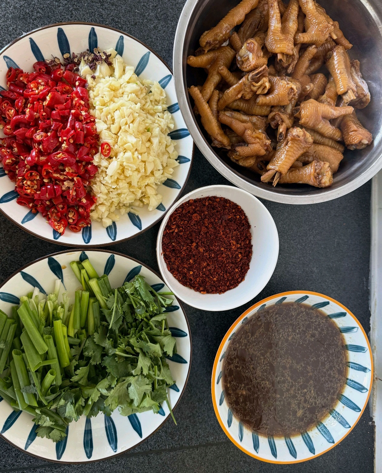 开大火收汁,汤汁会裹着蒜蓉辣椒碎往鸡爪的褶皱里钻,等到汤汁裹成亮闪闪的膜,抓一把葱段和香菜段撒进去,翻两下就关火。盛进大盘子里,热气裹着香往鼻子里冲,每只鸡爪都油亮油亮的,指尖挂着细碎的辣椒碎,刚才喊着“要一只”的孩子已经伸手抓了两只,啃得指尖都沾着酱。