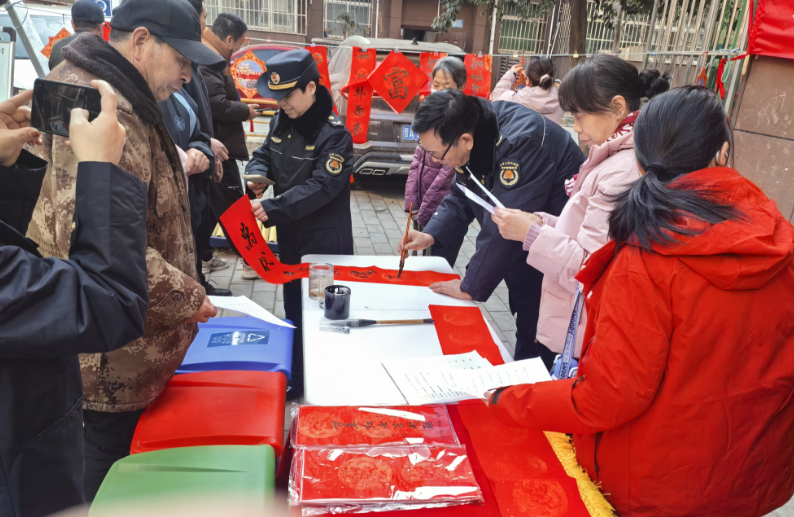 活动现场墨香萦绕,工作人员挥毫泼墨,一副副特色春联跃然纸上,既饱含传统年俗的喜庆韵味,又传递着绿色低碳的文明新风。居民们闻讯而来,或驻足围观欣赏书法创作,或排队等候领取心仪春联,脸上洋溢着幸福的笑容。