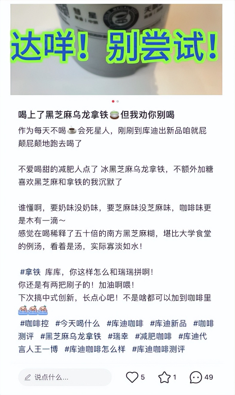 在库迪自身的宣传口径中,一直重点强调“采用有着四十余年历史的国民老字号南方黑芝麻的黑芝麻糊作为原料”。但天差地别的口感,可能是库迪只想借用一下南方黑芝麻的品牌知名度,一如此前每一次的联名,都是用足够博眼球的噱头来掩盖产品本身的平庸。