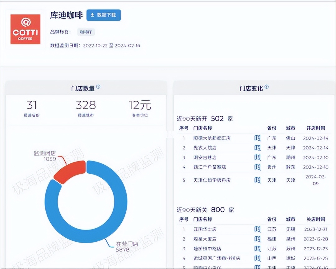 此前,库迪公开的门店数量达7000多家,但极海监测数据显示,近90天库迪闭店数量达800家,在营门店数量已经跌破6000家。