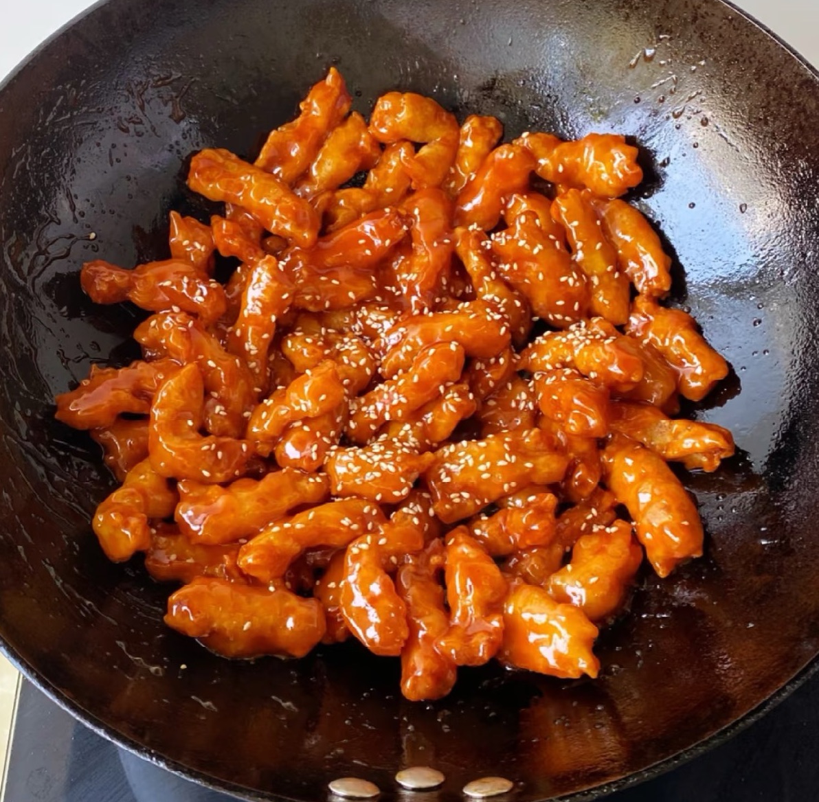 5.裹汁:将炸好的里脊肉倒入锅中,快速翻炒均匀,让每根肉条都裹上酱汁。出锅装盘,撒上熟白芝麻即可。
