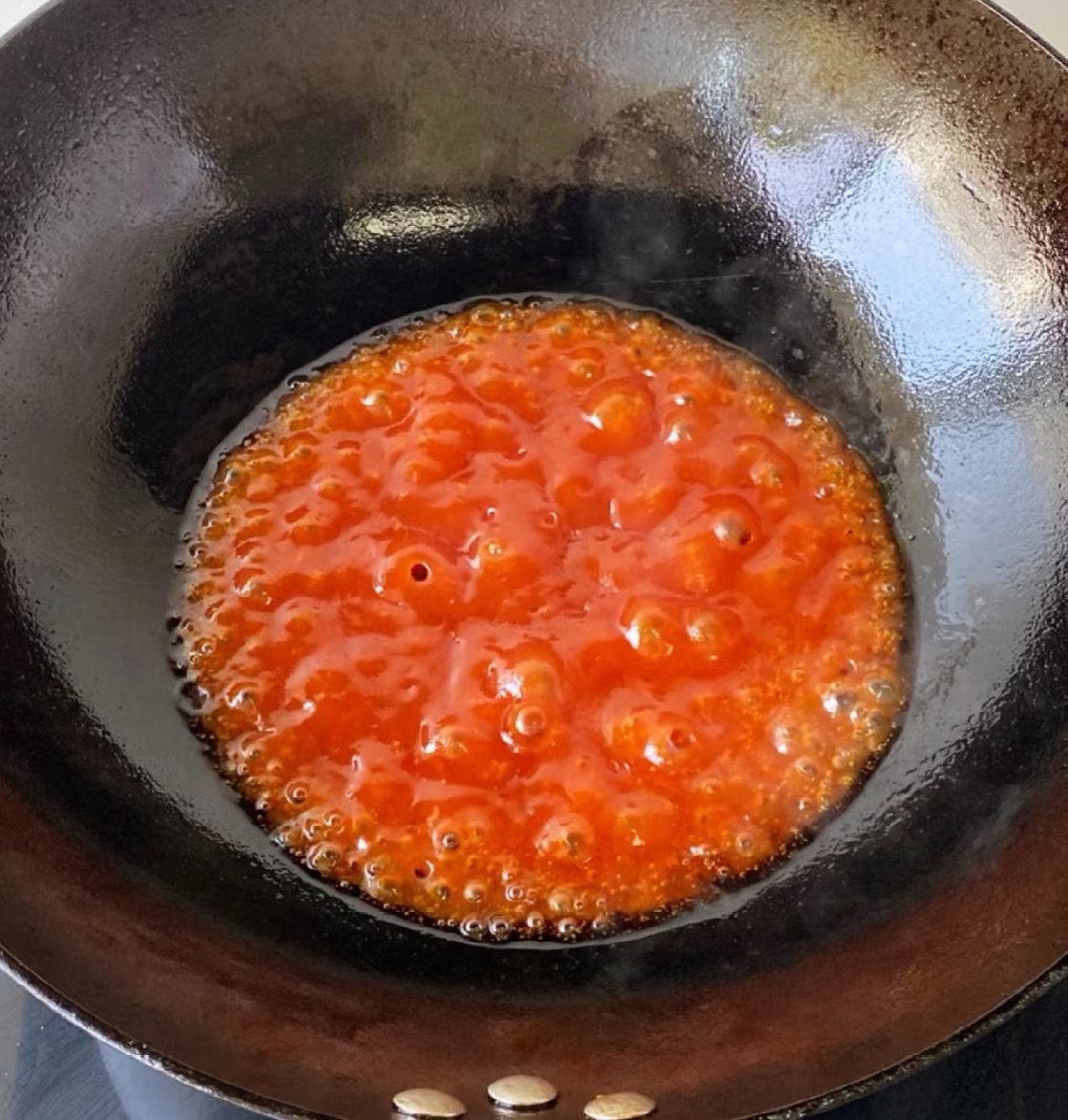 4.调汁:另起一锅,留少许底油,放入3勺番茄酱、2勺白糖、1勺白醋和少许清水,小火熬至冒泡,汤汁浓稠。