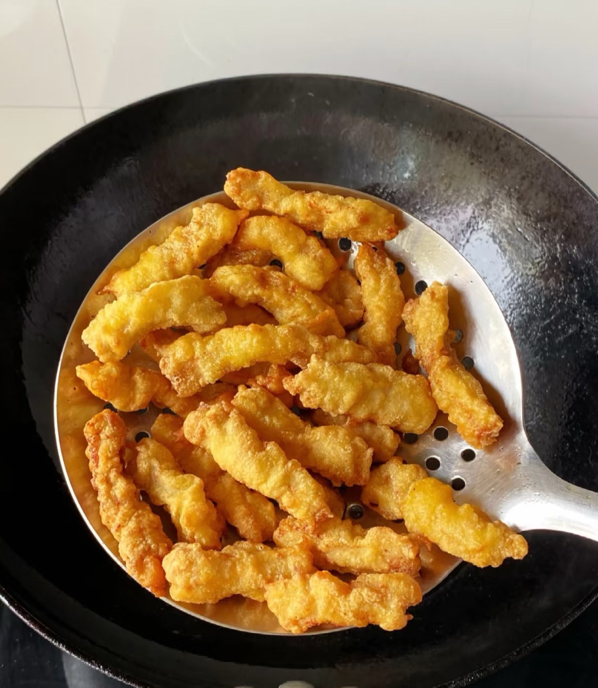 3.炸制:锅中倒油,烧至六成热(插入筷子周围冒小泡)。将肉条一根根下入锅中,中火炸至表面微黄定型后捞出。待油温升高至八成热,复炸一次,炸至表面金黄酥脆,捞出控油。