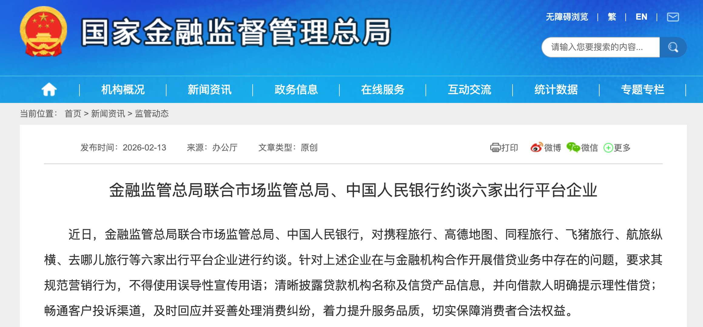 2026年2月13日,国家金融监督管理总局联合市场监管总局、中国人民银行,集中约谈携程旅行、高德地图、同程旅行、飞猪旅行、航旅纵横、去哪儿旅行六家主流出行平台,直指平台在联合金融机构开展借贷业务中存在的合规问题,要求全面整改,保护金融消费者权益。