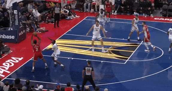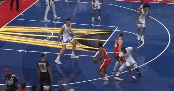 边线球回合,弱侧的伦纳德同时借助祖巴茨的“Pin Down”(下掩护)兜出接球,接哈登传球后祖巴茨再翻转掩护角度与伦纳德衔接边路挡拆配合,