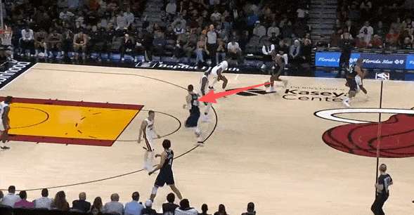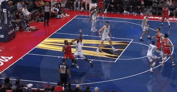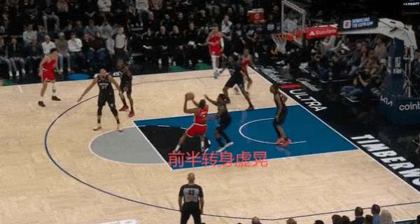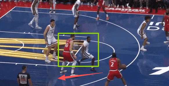 要到希罗错位后前去低位要球,接到球的瞬间丰泰奇奥上前执行强侧夹击,伦纳德迅速向中路前转身从丰泰、希罗两人之间穿过躲避夹击,