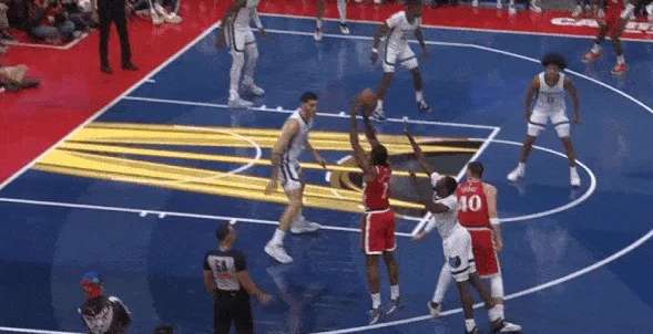 炸球后迎着三人防守起身出手后仰中投,打进2+1。