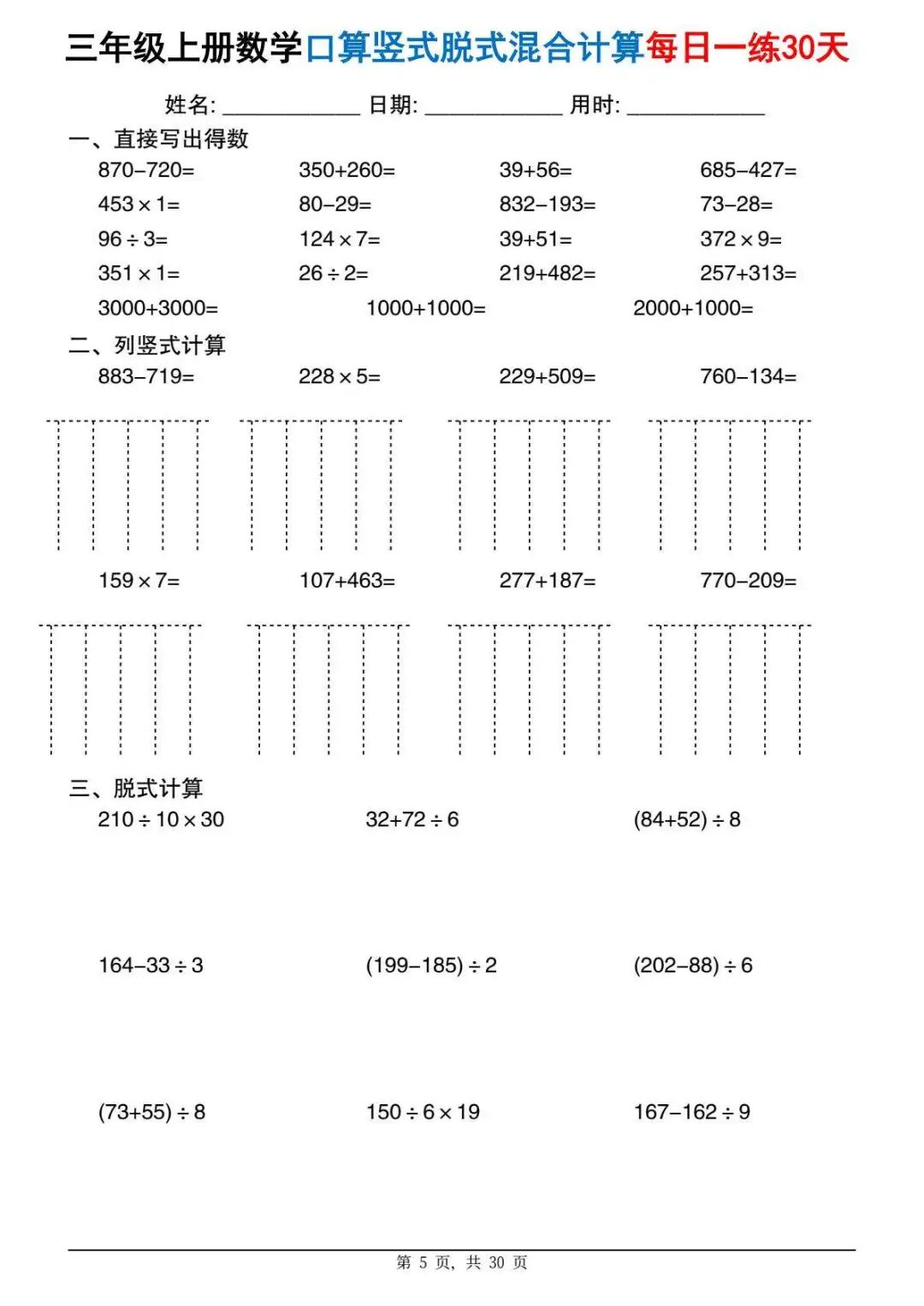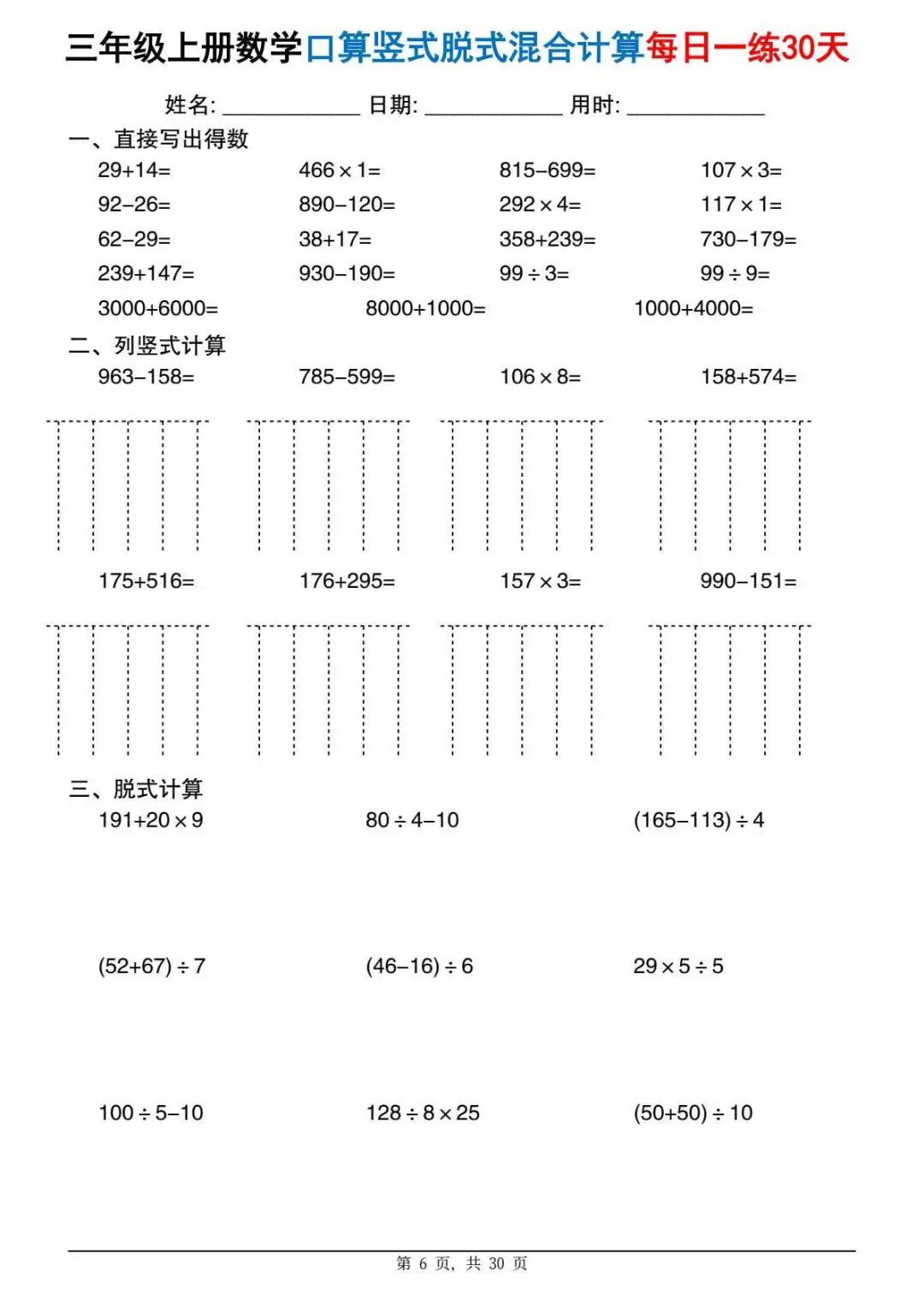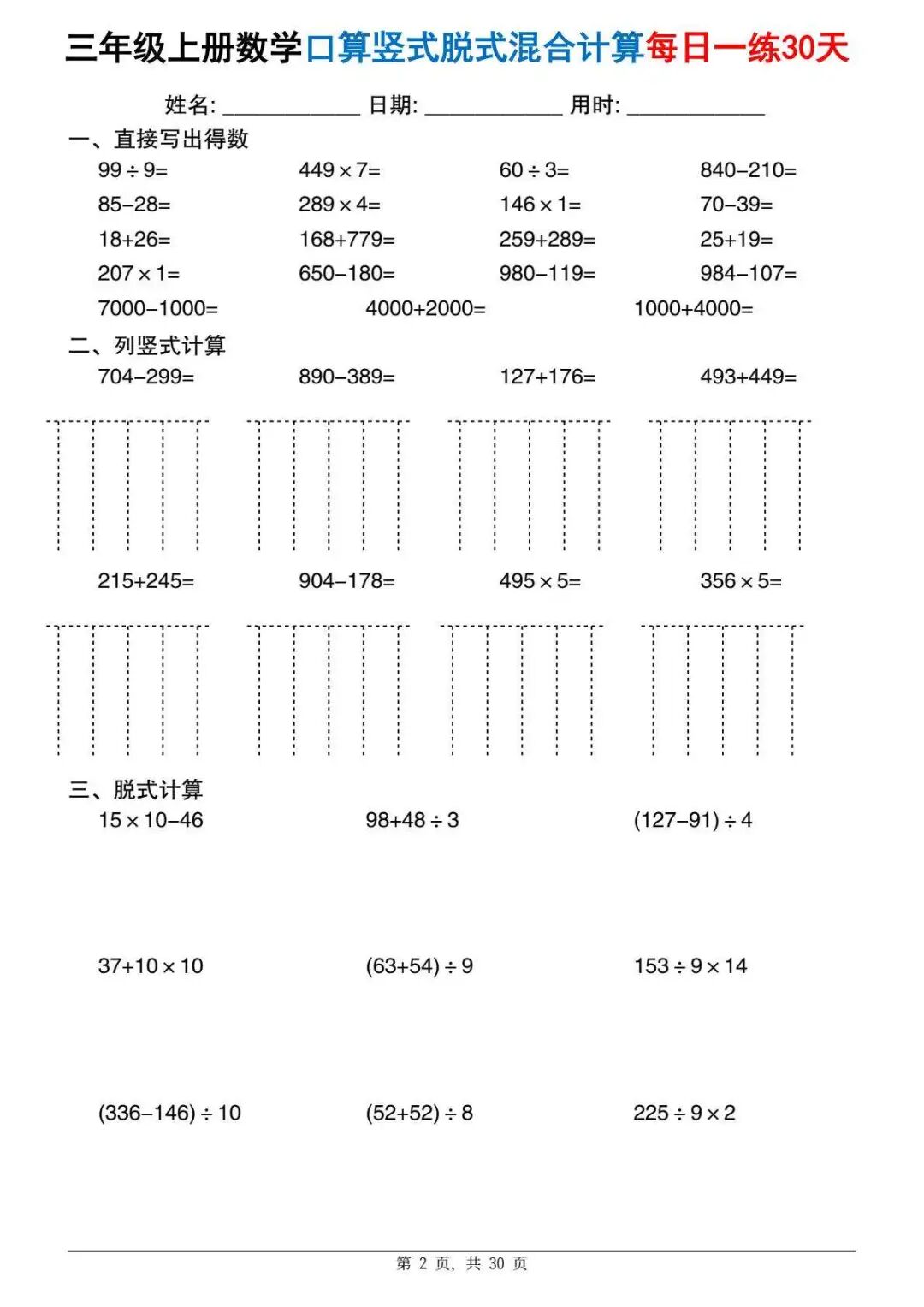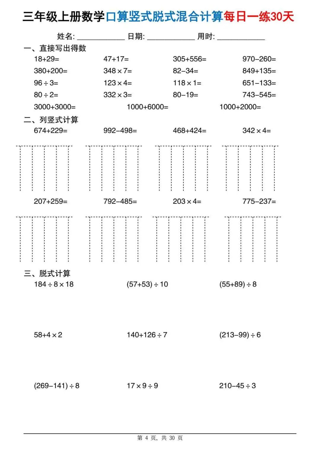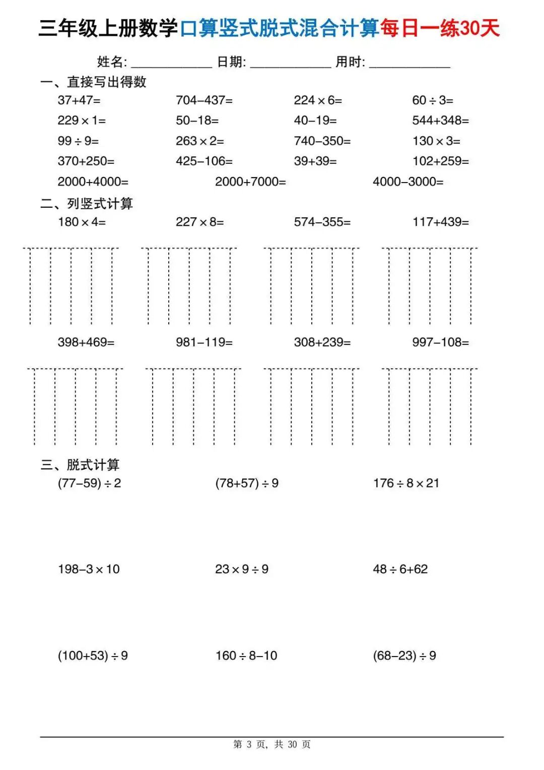 今天分享一份很实用的资料——三年级上册数学口算竖式脱式混合计算每日一练30天。