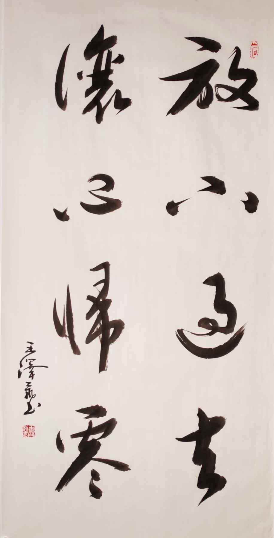 专家评述:王泽飞的作品用笔极具节奏感,沉实处不激不厉、温文尔雅,激荡处行笔如飞,一气呵成,笔下线条跃宕多姿,又富有弹性,可谓韵致盎然,师古而不泥于古,更具创新精神,在古典与现代的结合处,形成了自己有意味的形式。