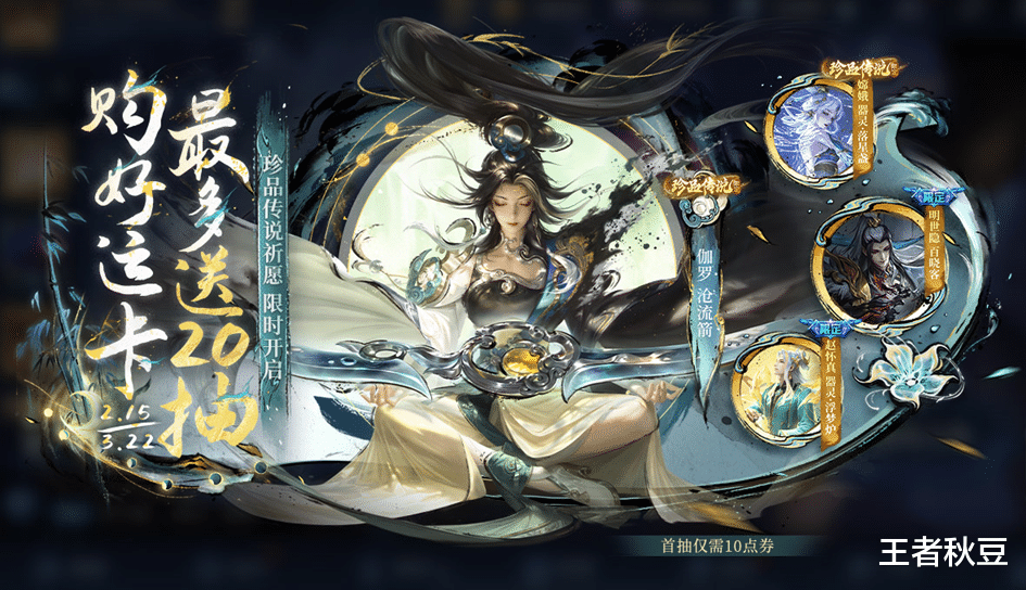 活动时间:2月15日-3月22日限时开启,开通好运卡可以直接领10抽,拥有本期任意珍品传说皮肤且抽奖40次,再领10抽!最多可以领20抽。明世隐-百晓客史诗限定皮肤也在本奖池内,仅需138墨染兑换币,运气好的话,10抽就能抽到。嫦娥-器灵·落星盏、赵怀真-器灵·浮梦炉皮肤两款皮肤限时返场。