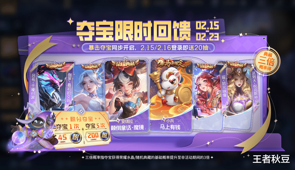 暴击夺宝限时开启,官方直接送20抽暴击夺宝券,暴击夺宝获得随机典藏的基础概率提升至非本期活动期间的三倍,如果要随意典藏的话,暴击夺宝更容易抽到典藏奖励。