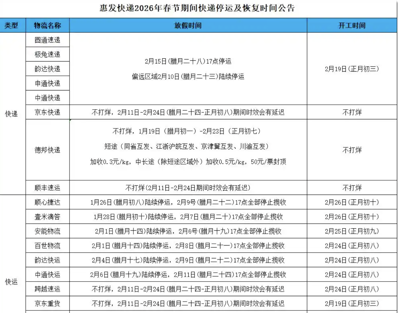 与此同时,多家快递企业的快运业务公布明确放假停运时间,均集中在腊月下旬至正月初七左右。中通快运将于2月13日(腊月二十六)至2月23日(正月初七)放假,2月24日(正月初八)全面恢复;韵达快运放假时间为2月12日(腊月二十五)至2月23日,节前车线将逐步停发;百世快运则从2月11日(腊月二十四)开始放假,与中通、韵达同步于正月初八复工。需要注意的是,加盟制快递总部虽有统一安排,但中转站点、加盟商可能自行放假,易导致快件滞留。