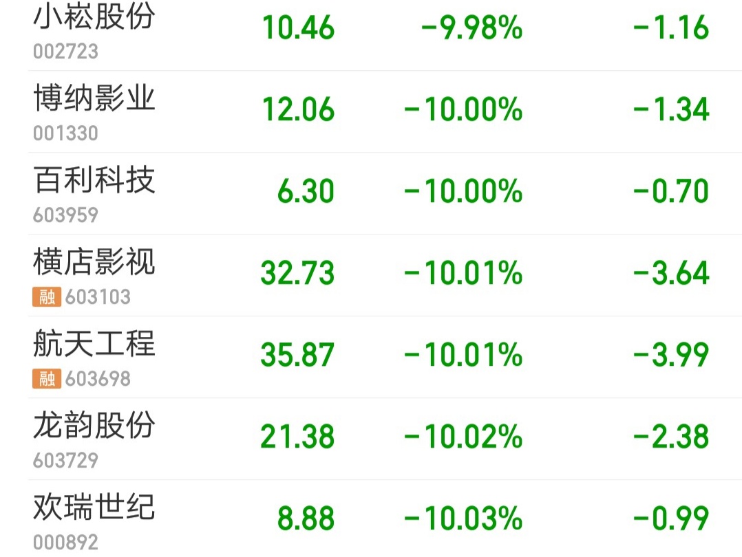 此外,今日跌停股还有:小松股份 -9.98%,博纳影业 -10.00%,百利科技 -10.00%,横店影视 -10.01%,航天工程 -10.01%,龙韵股份 -10.02%,欢瑞世纪 -10.03%。