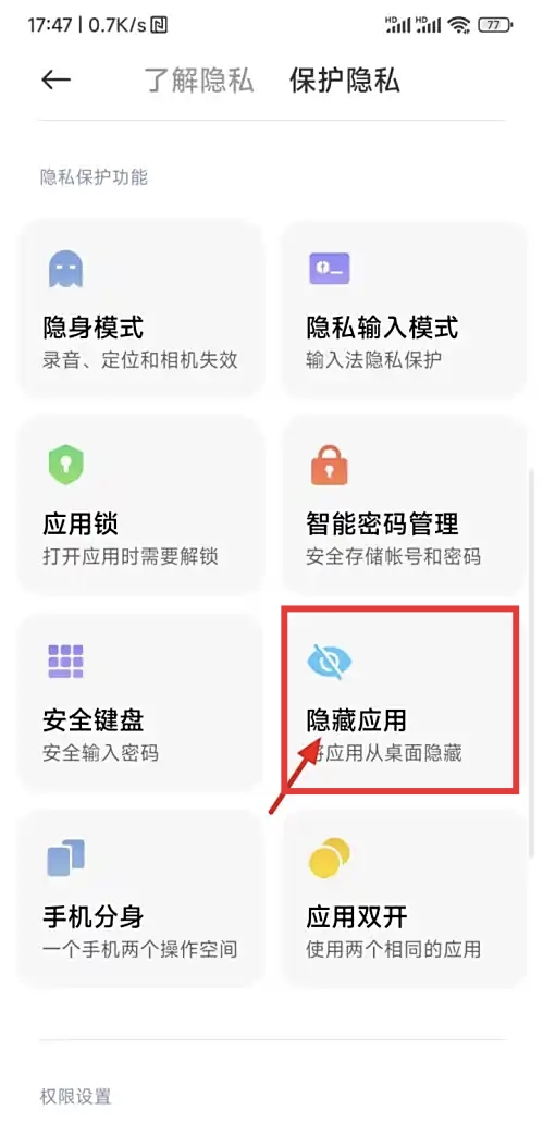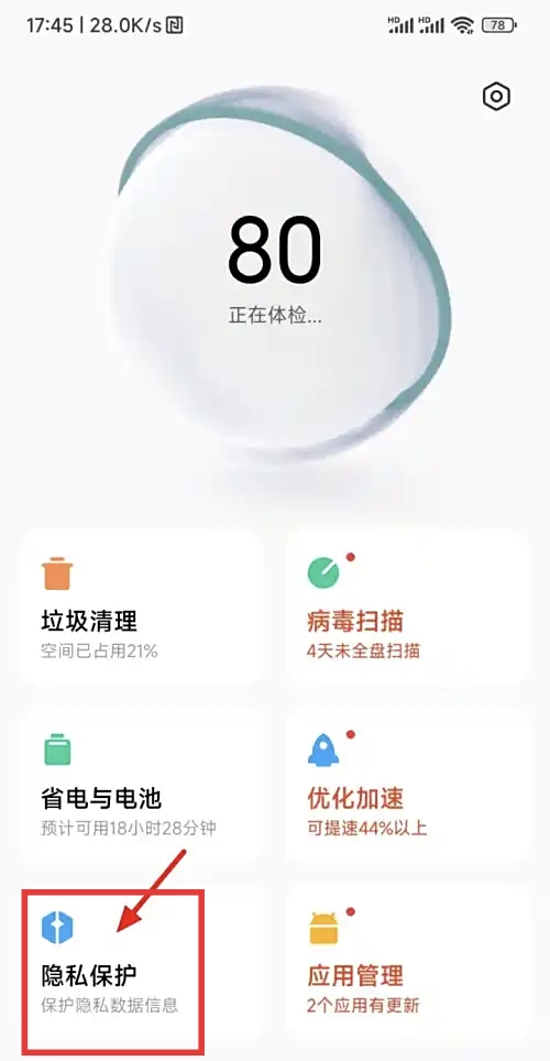 1.首先打开手机管家页面,点击:隐私保护。2.进入隐私保护页面后,点击:保护隐私。3.进入到保护隐私页面后,点击:隐私应