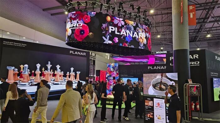 全新Planar®DirectLight® Essential 系列成为展台焦点,其打造的巨型LED显示屏对角线长度达27英尺(超8米),凭借0.9毫米像素间距与8K超高清分辨率,可呈现极致逼真的全彩画面,还原真实视界。产品采用COB技术打造,兼具高像素密度、高能效与强耐用性,独特LED分选工艺及专有驱动IC,有效改善亮度与色彩一致性问题,并支持前维护设计。