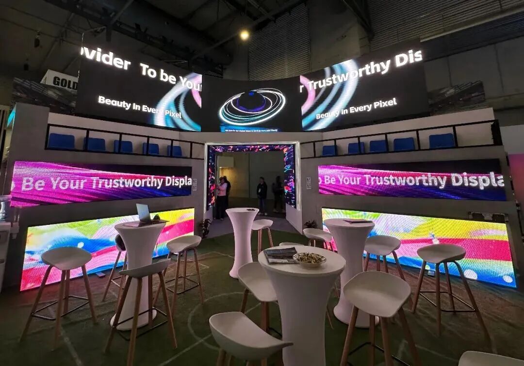 创意显示区由UE系列展架屏与US系列柔性屏组合构成,该方案高度兼容标准化展架系统,强调快速部署、灵活造型与内容便捷更换的能力,精准服务于对布展效率与创意呈现有双重要求的展览展示市场。