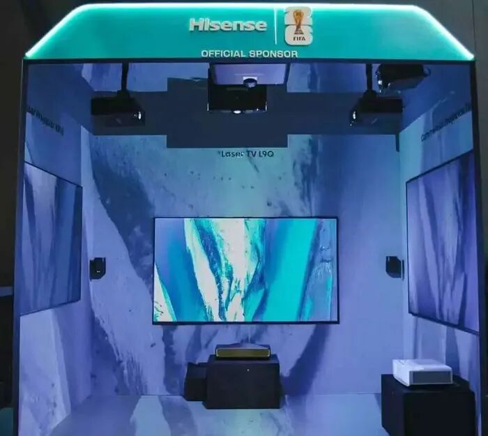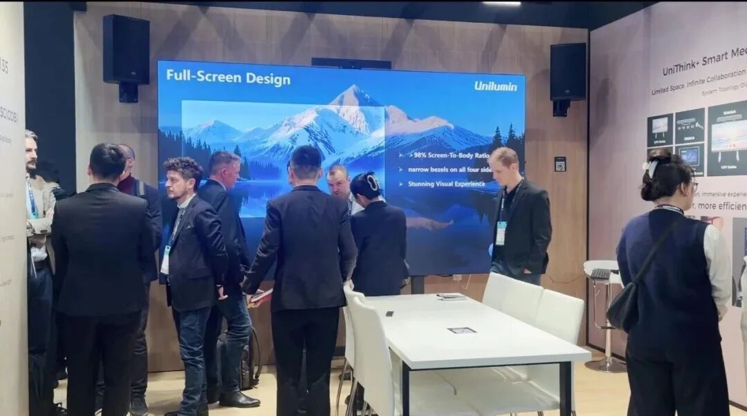 在展位会议室展示区的UTV SC X,产品箱体厚度≤12mm,比传统产品轻40%以上,可贴装于任意材质墙面;且无需专业工程师耗时调试,即插即显;EBL+至臻画质带来柔和视觉,配合低压供电与多重保护,产品达到了家用级安全标准。