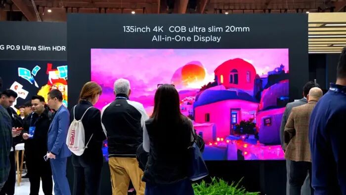 本次展出的108"/136"COB LED一体机采用海信独家 3-in-1 ASIC 架构,结合共阴驱动技术与自研节能算法,在确保卓越画质的同时,功耗较上一代COB产品降低近20%,助力客户实现可持续运营。同时,全球首发54"COB LED标牌产品,同样采用海信自研ASIC架构,大尺寸标准箱体+COB大灯板设计,支持HDMI Daisy Chain, 满足VESA壁挂标准,内置VisionInfo, 可实现无缝拼接,方便客户快速安装,相比传统LED拼接节能30%以上,备受观众瞩目。