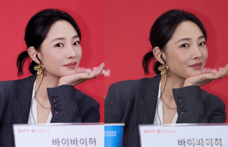 白百何不管是在私下里还是在红毯上,都很注意配饰的搭配,比如在参加活动时,会选择比较夸张点的耳饰来搭配基础的服饰,比如下面的金色立体耳环,搭配灰色西装和白色衬衫,大领口衬衫搭配细细一根颈链,轻松就能打造出高级感。