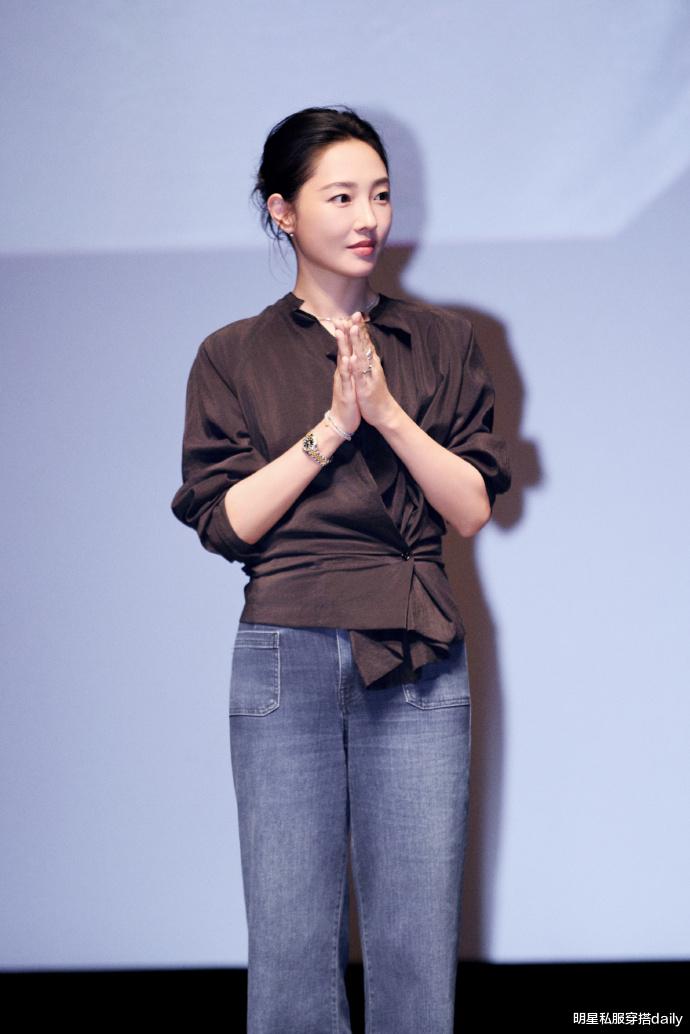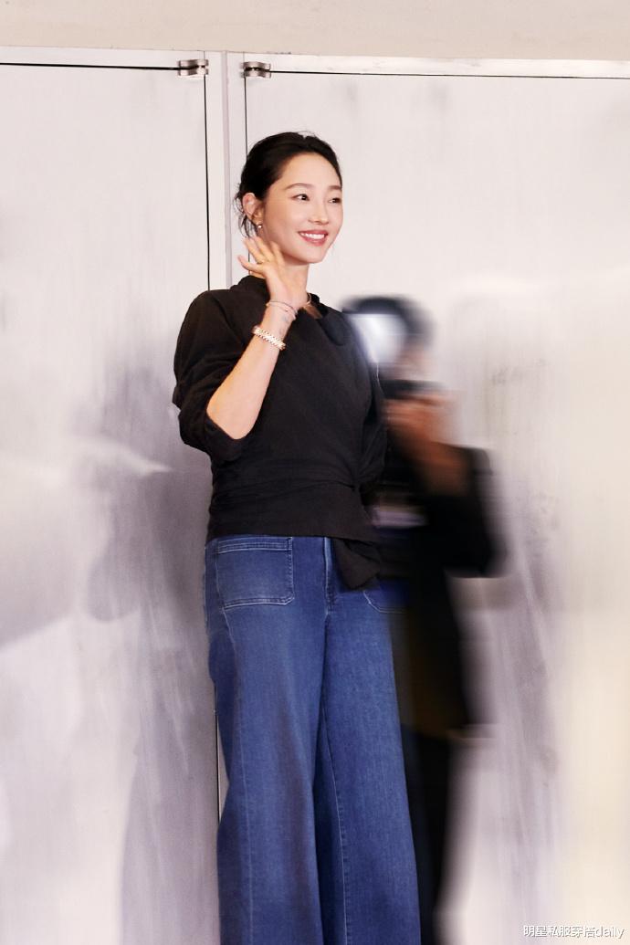 在釜山电影节活动中,她的造型便是典型案例:上身选择黑色裹胸设计衬衫,裹胸元素巧妙露出精致锁骨,打破基础款的沉闷,同时衬衫的利落剪裁贴合身形,不紧绷也不松散;下装搭配高腰阔腿牛仔裤,高腰设计拉长腿部比例,阔腿版型修饰腿型,与171cm 的身高相得益彰,让整体身形更显挺拔。
