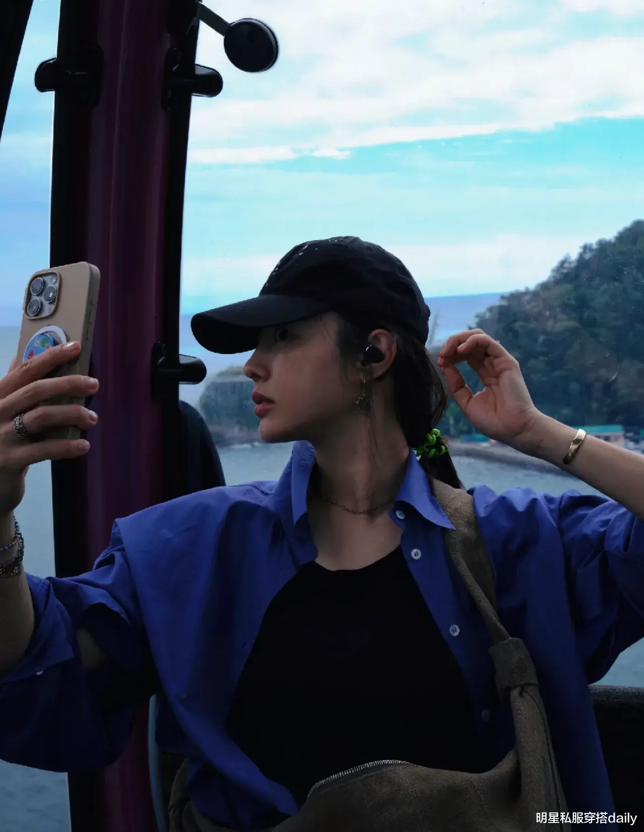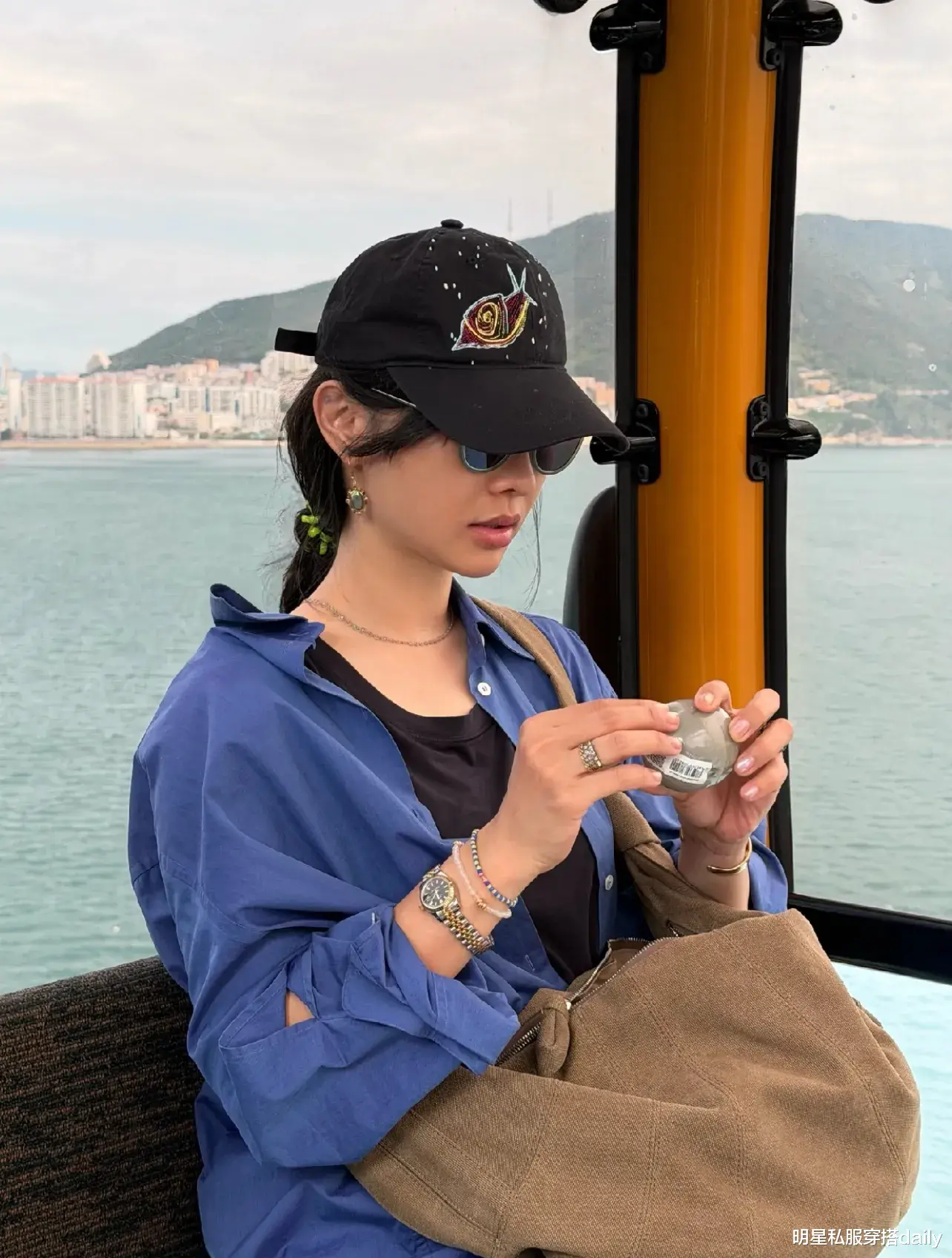 看她最近晒出的自拍照,穿着一件蓝色宽松款的衬衫,内搭一件黑色无袖背心,头戴棒球帽,专选有符合自己风格的小众饰品。把中年女人该有的从容优雅,诠释得刚刚好。