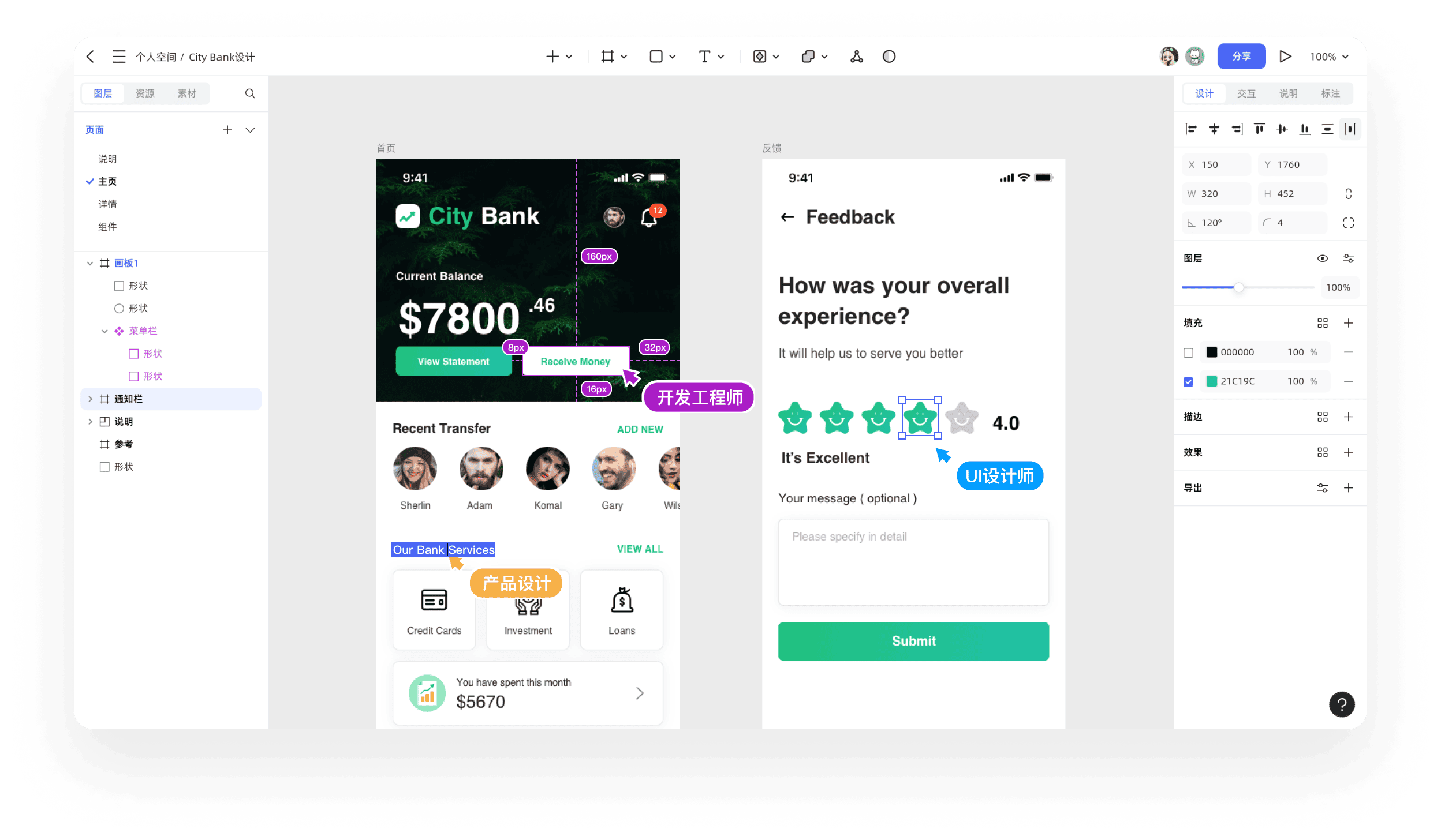 1)UI能力全覆盖:提供专业的矢量编辑能力、全局变量、自动布局、高级组件封装等高级设计能力,轻松实现复杂的高保真设计。