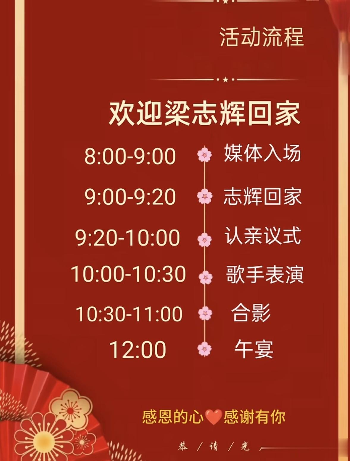 明天就是梁志辉的认亲宴了,妹妹晒出了认亲宴的活动流程,其中还有歌手表演。