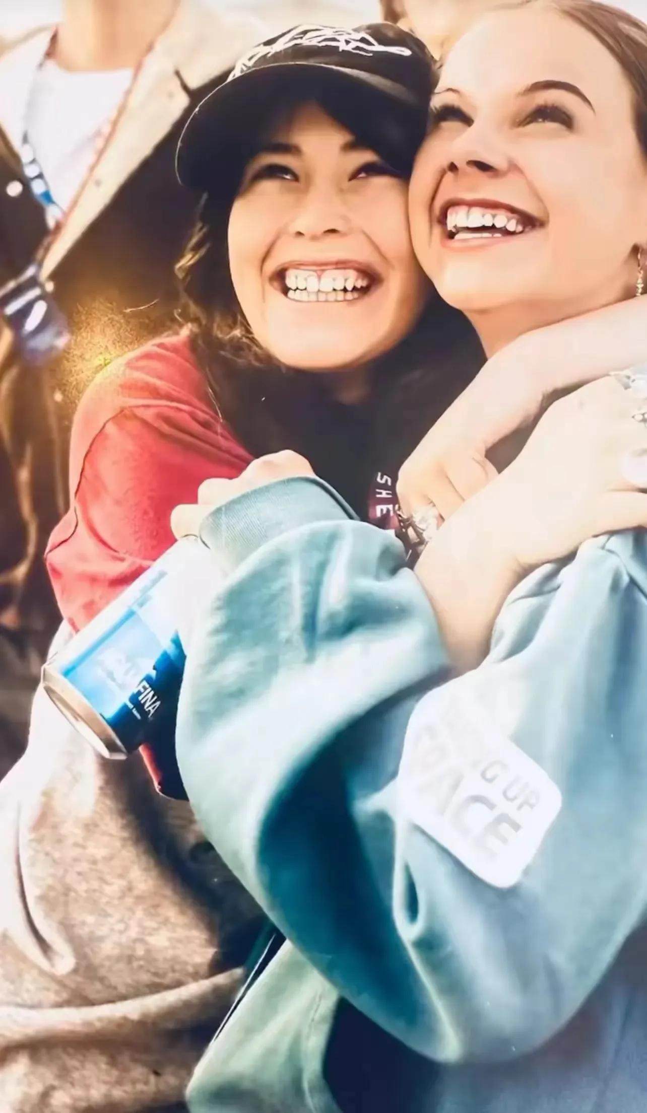 身穿蓝色保罗衫的贝佐斯也开心地为继女鼓起掌来!