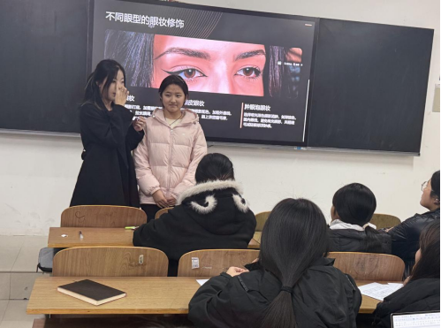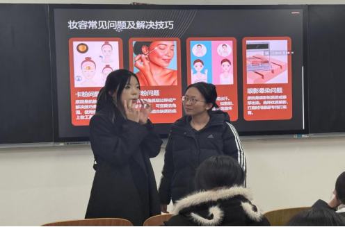 药学系24级药学4班陆雪婷以“实操教学+针对性辅导”为核心模式,内容贴合实际、兼顾实用与专业。课堂上,陆雪婷细致讲解肤质判断、基础护肤流程、护肤品适配等知识点,重点示范日常淡妆与职业淡妆打造技巧,从底妆服帖度到眉眼修饰,逐一拆解步骤。同学们专注投入、积极实操,主动分享护肤困惑,现场交流氛围热烈。