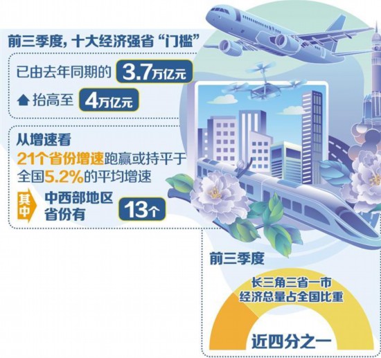 31个省份经济运行“三季报”均已发布。今年以来,面对外部压力加大和内部困难较多的复杂局面,我国经济发展顶住压力稳中有进。从地方层面看,各地全力以赴稳增长、扩需求、育动能,多个省份经济总量迈上新台阶,21个省份增速跑赢或持平于全国水平,发展韧性不断增强。