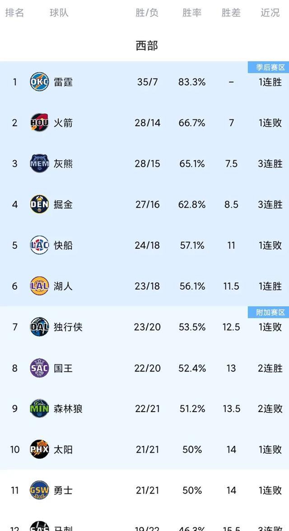 说完今天的比赛,咱们来看看NBA西部的排名情况吧。这就像是一场马拉松比赛,大家你追我赶的。掘金3连胜,紧紧地跟着灰熊,排在第4的位置。这两队就差一个胜场,差距很小啊。而且他们还领先后面的快船2.5个胜场呢,可以说暂时是比较稳的。湖人呢,现在是23胜18负,落后快船半个胜场,在第6的位置。不过他们也领先第7的独行侠一个胜场,还是有一定的优势的。