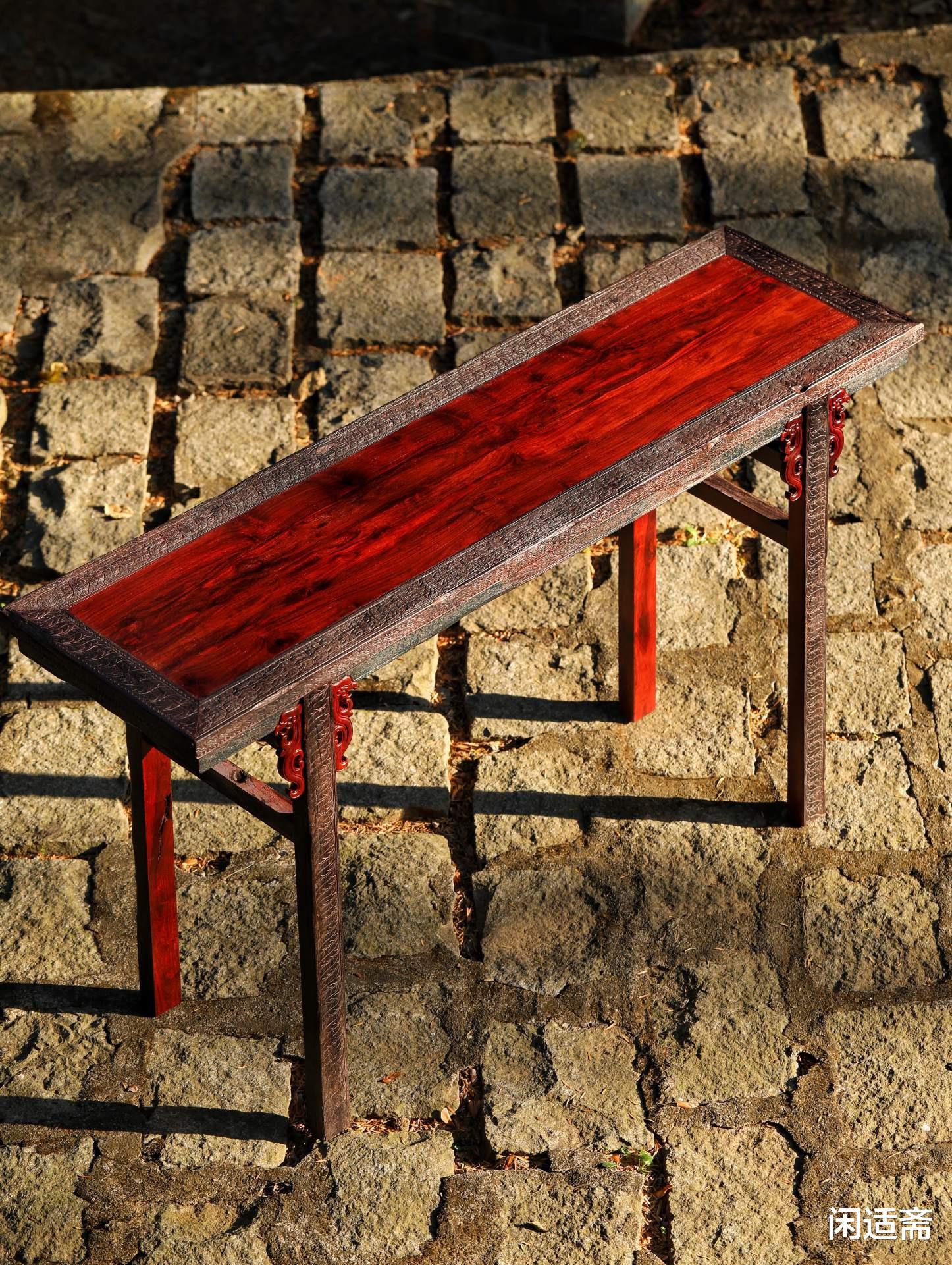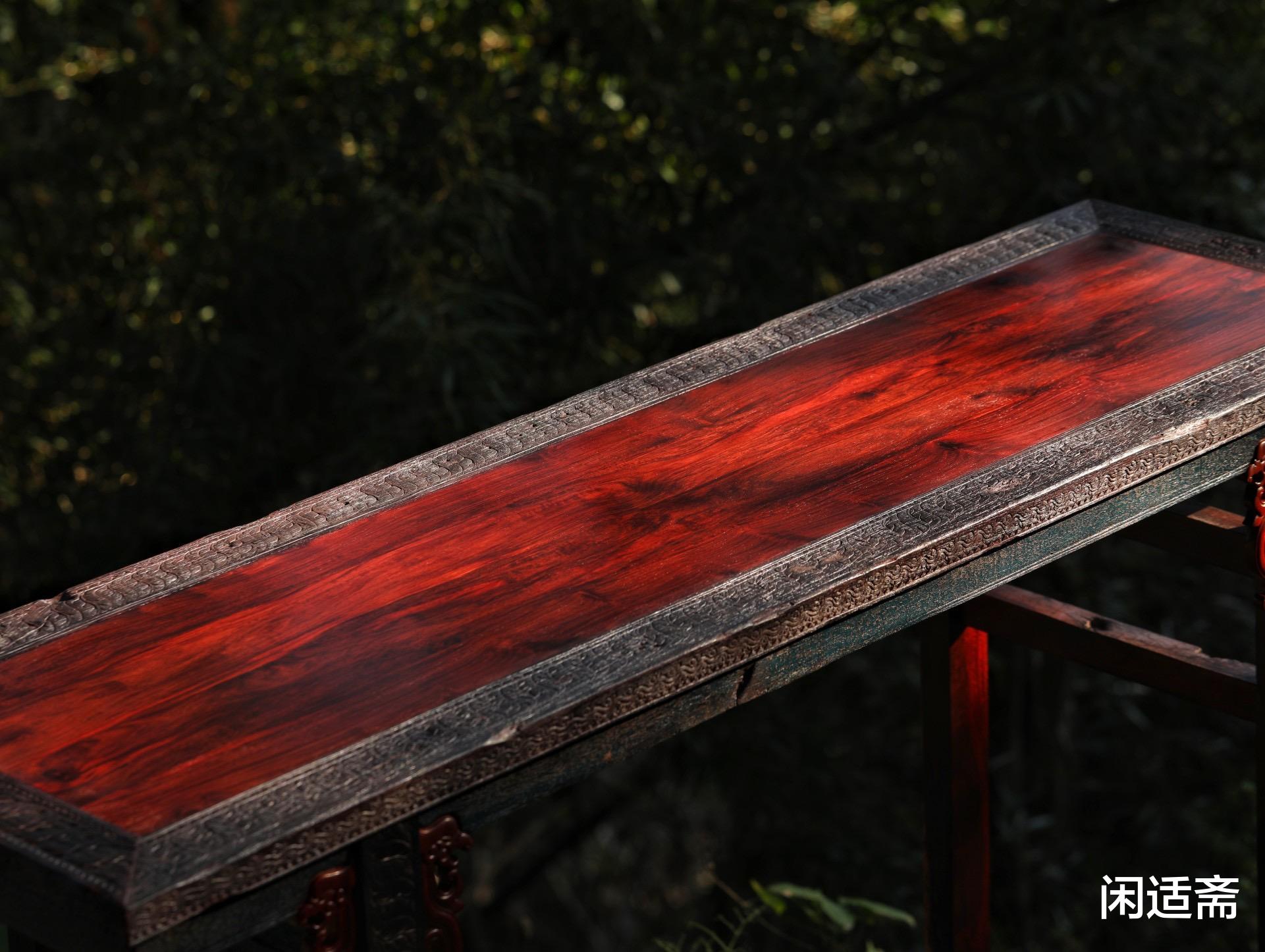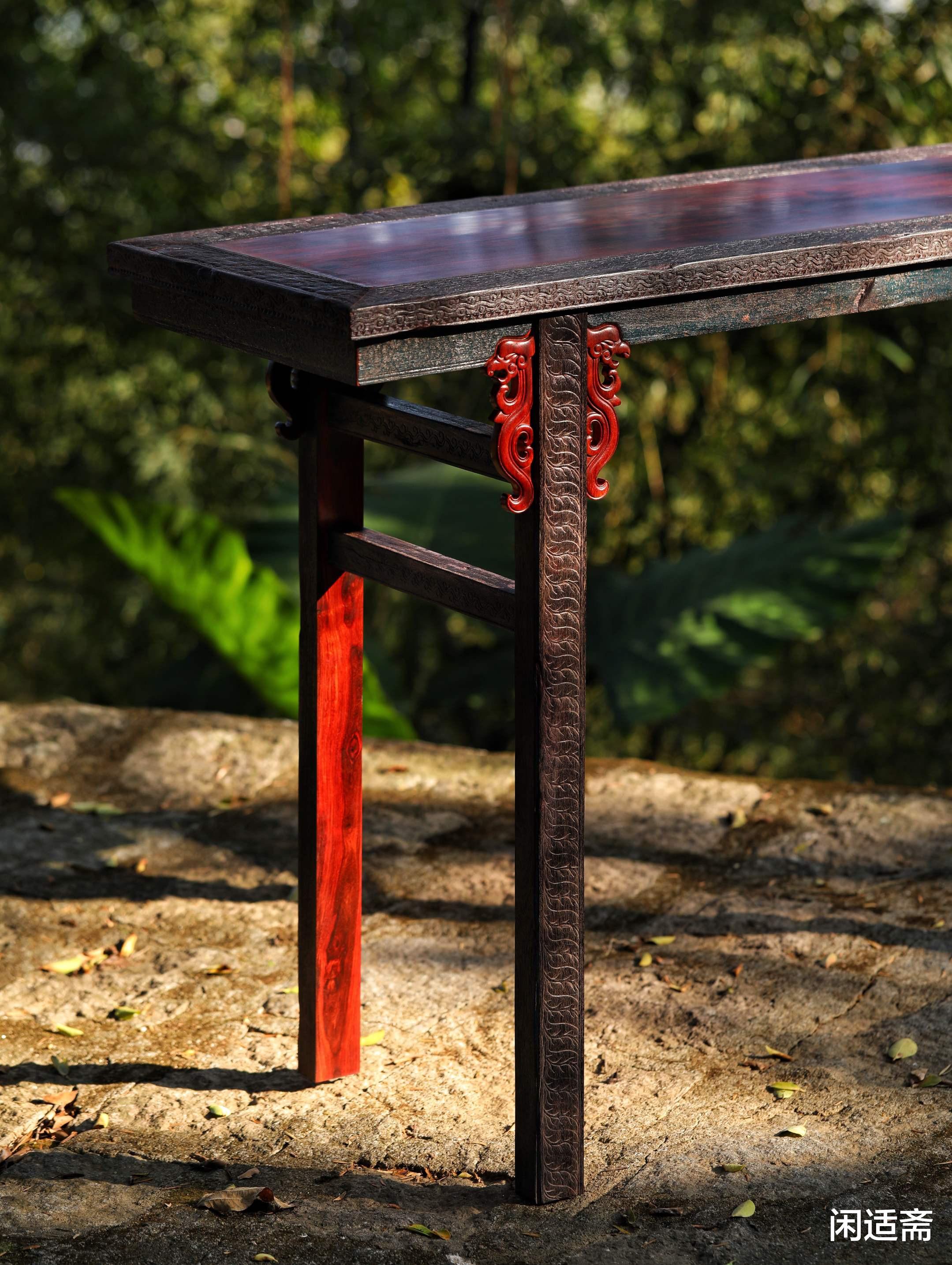 此平头案通体采用印度小叶紫檀拆房雕花老料制作,拆房老料历经岁月沉淀,质地愈发细密如缎,触感细腻温润、无丝毫粗糙之感;色泽沉润似酒,光泽莹润通透,历经自然氧化后形成的皮壳沧桑古雅,自带岁月沉淀的厚重质感,木质本身的细密质地的与精湛的雕刻工艺相得益彰,沧桑的皮壳更凸显出器物的岁月韵味,无需多余装饰,仅以材质本真与工艺巧思,便成就了这件藏家臻品。是小叶紫檀中的珍稀之选,兼具极高的实用性与收藏潜力。