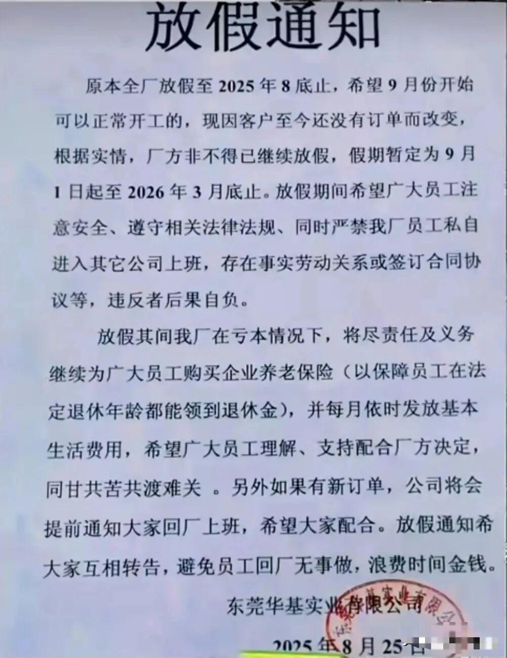 “又收到放假通知了”,东莞常平镇的老陈看着手机里的短信,心里五味杂陈——这是华基实业发来的第10份放假通知,从2020年8月到2026年3月,假期一延再延,整整5年半,可工资和社保从没断过。华基实业的大门关了5年半,可厂里200多号员工心里踏实——每月工资卡准时到账,社保缴费记录从没断过,这事儿在打工圈传得忒让人暖心。