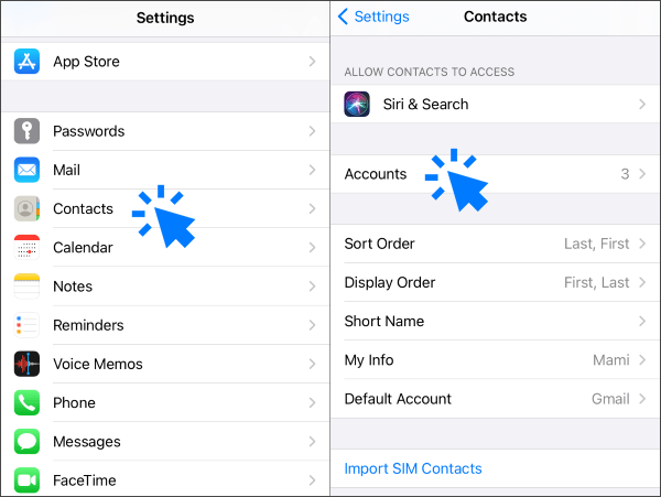 步骤1.启动iPhone的“设置”应用,然后导航到“联系人”部分。点击“帐户”选项,然后选择一个Gmail帐户。