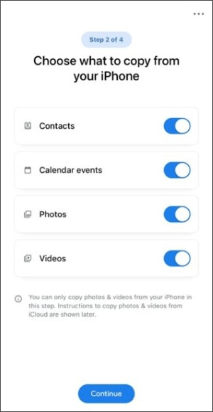 方法 2:如何通过切换到Android应用将联系人从 iPhone 传输到Android您可以使用“切换到Android应用将联系人从 iPhone 移动到Android设备。这款出色的数据传输应用专为在Android Android初始设置过程中将 iPhone 数据传输到 Android 设备而设计。不过,此方法仅适用于运行Android 12 及更高版本的Android设备。