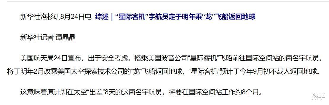 结果,这个空间站还不如不进呢,原计划它俩就在空间站待8天,结果现在NASA宣布,波音飞船独自返回,两名宇航员明年2月再回来,原地加班8个月,还得靠着spaceX的龙飞船对它进行 太空救援。