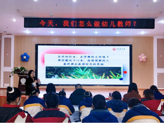 中午12:45分,孙敏在幼儿园活动大厅为全体教师带来了一场题为“今天,我们如何做幼儿教师”的深度研修与思想盛宴。羊山哈敦幼儿园园长陈继红为本次学习致辞并再次欢迎和感谢《学前微主编》孙敏的到来。