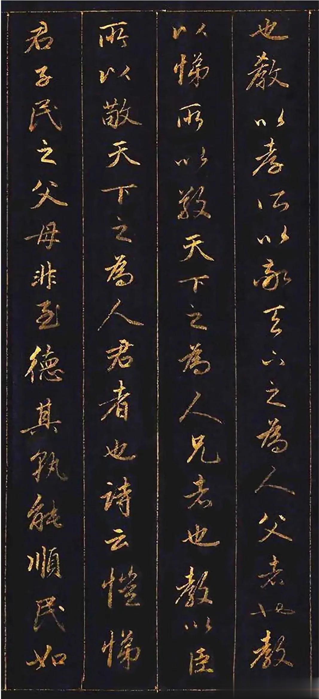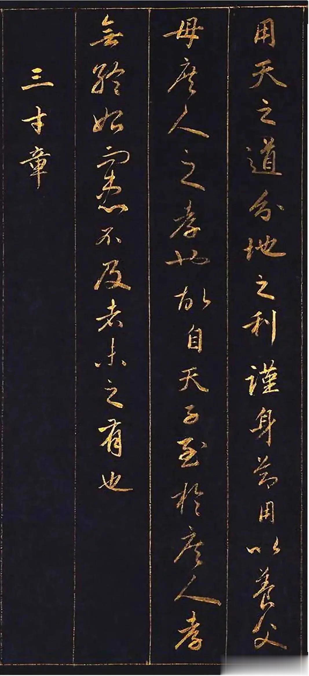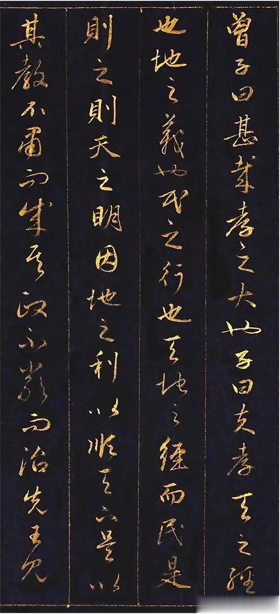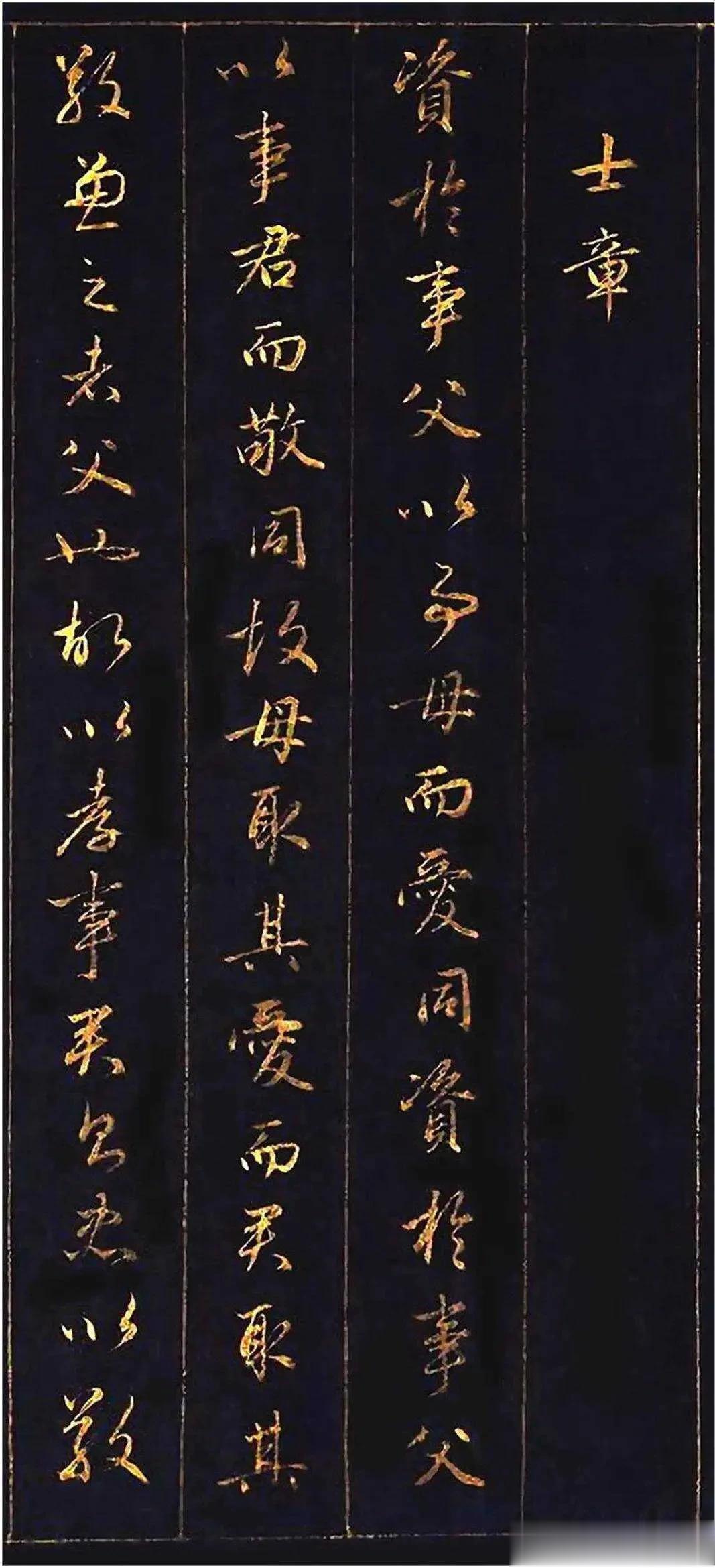 赵孟頫金书《孝经》18章,最动人的是乌楮墨底与金粉的相衬——金粉凝润匀净,既无浮艳刺目之弊,又裹着雅贵的哑光质感,落笔处浓淡随笔锋提按自然晕化。