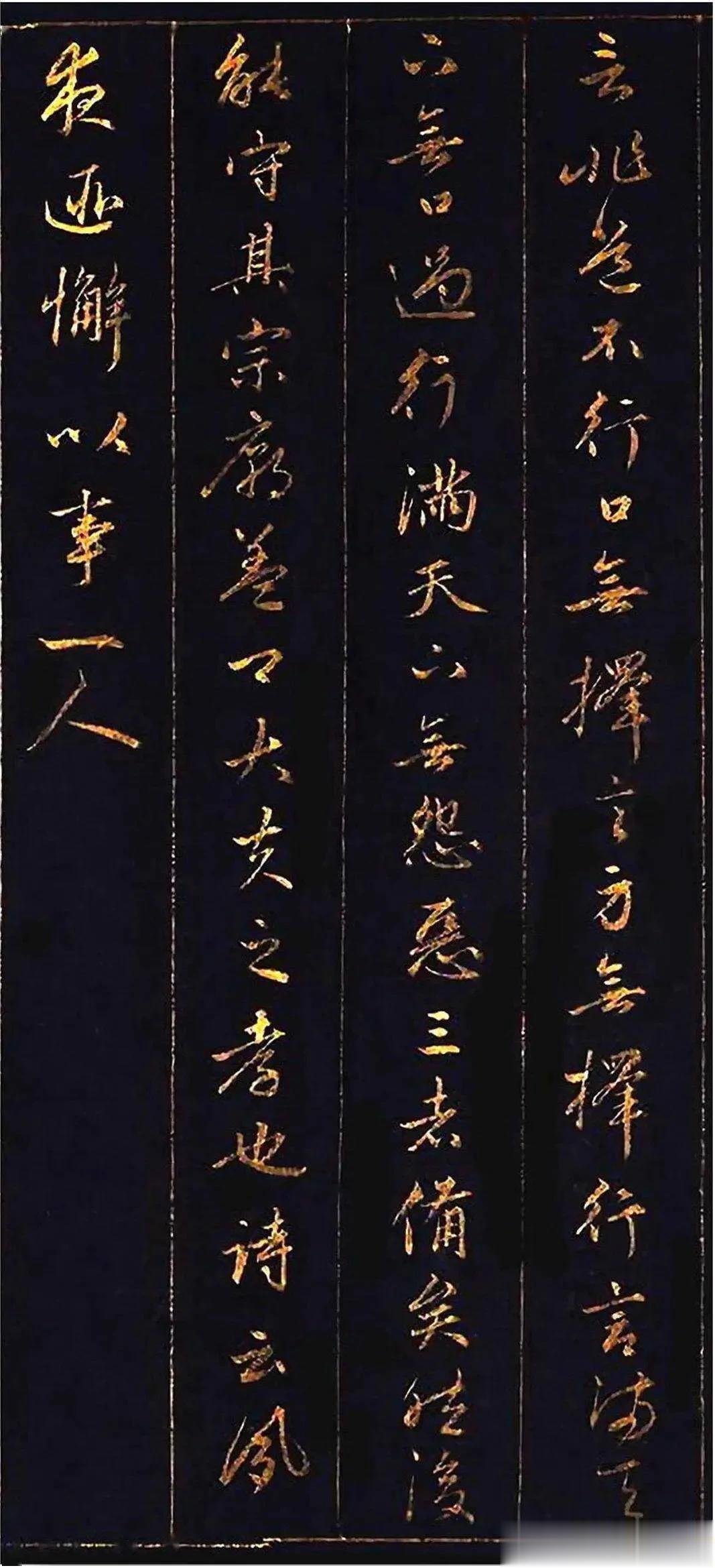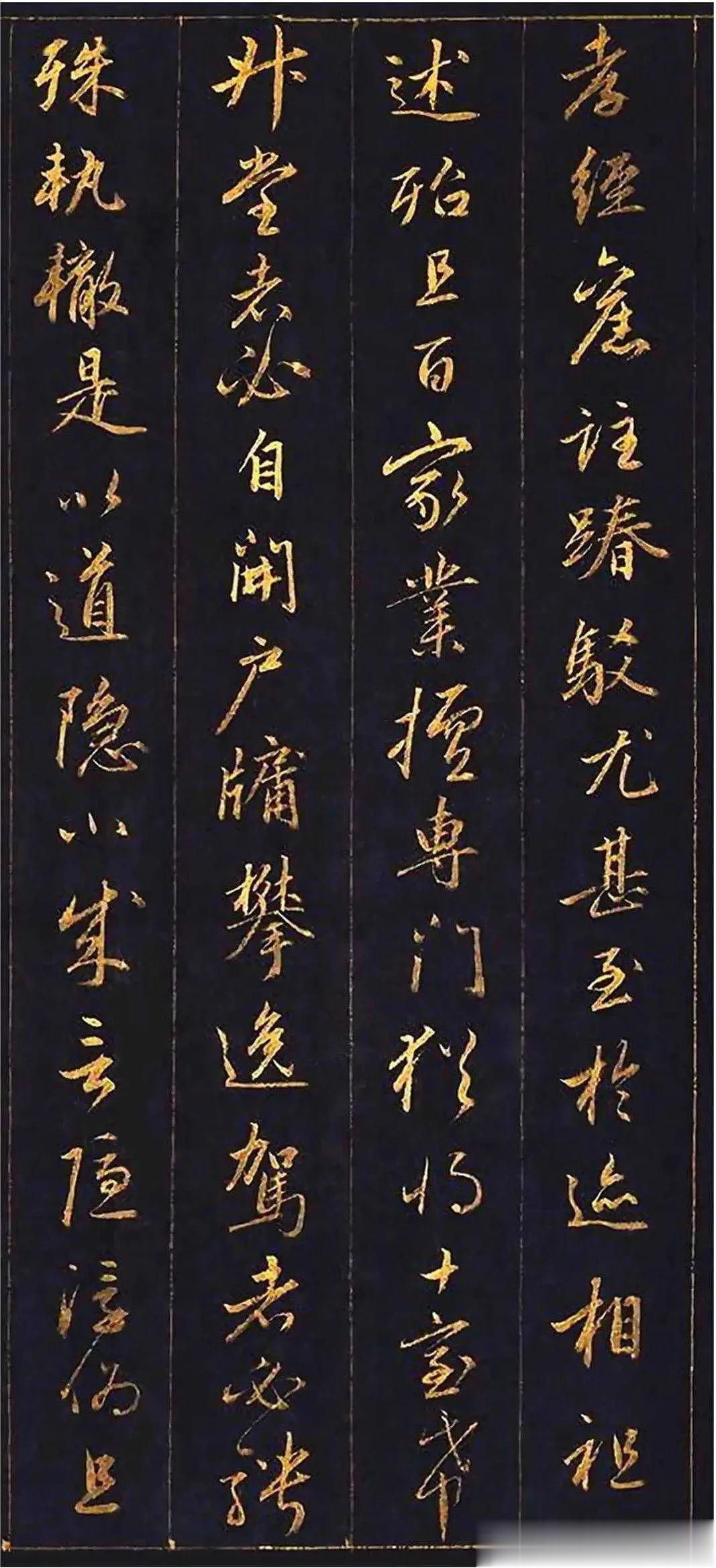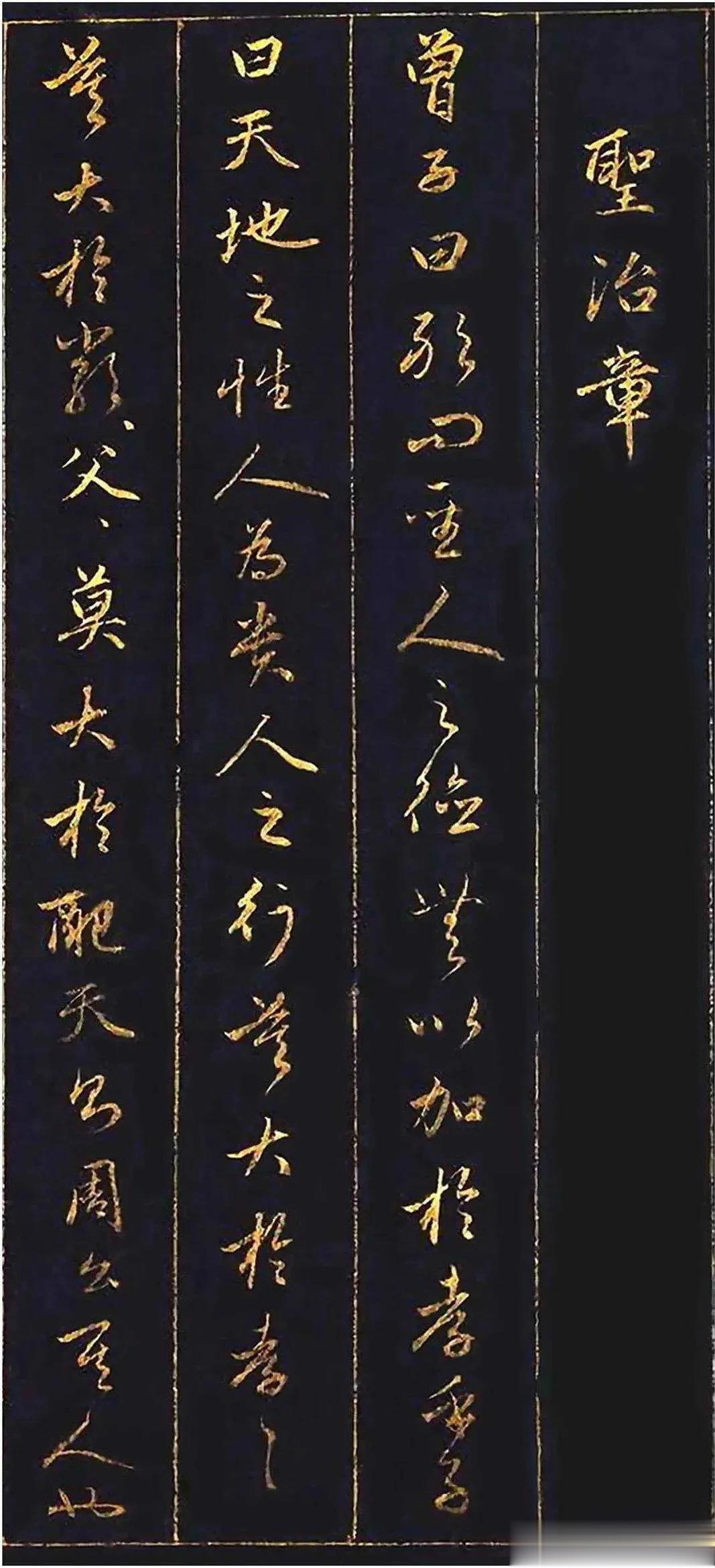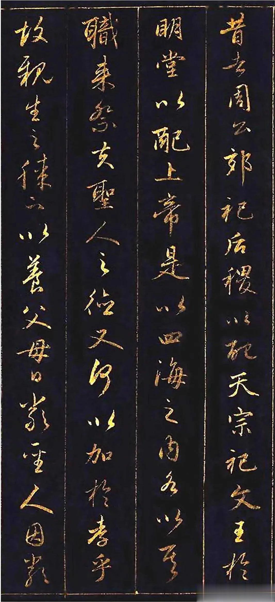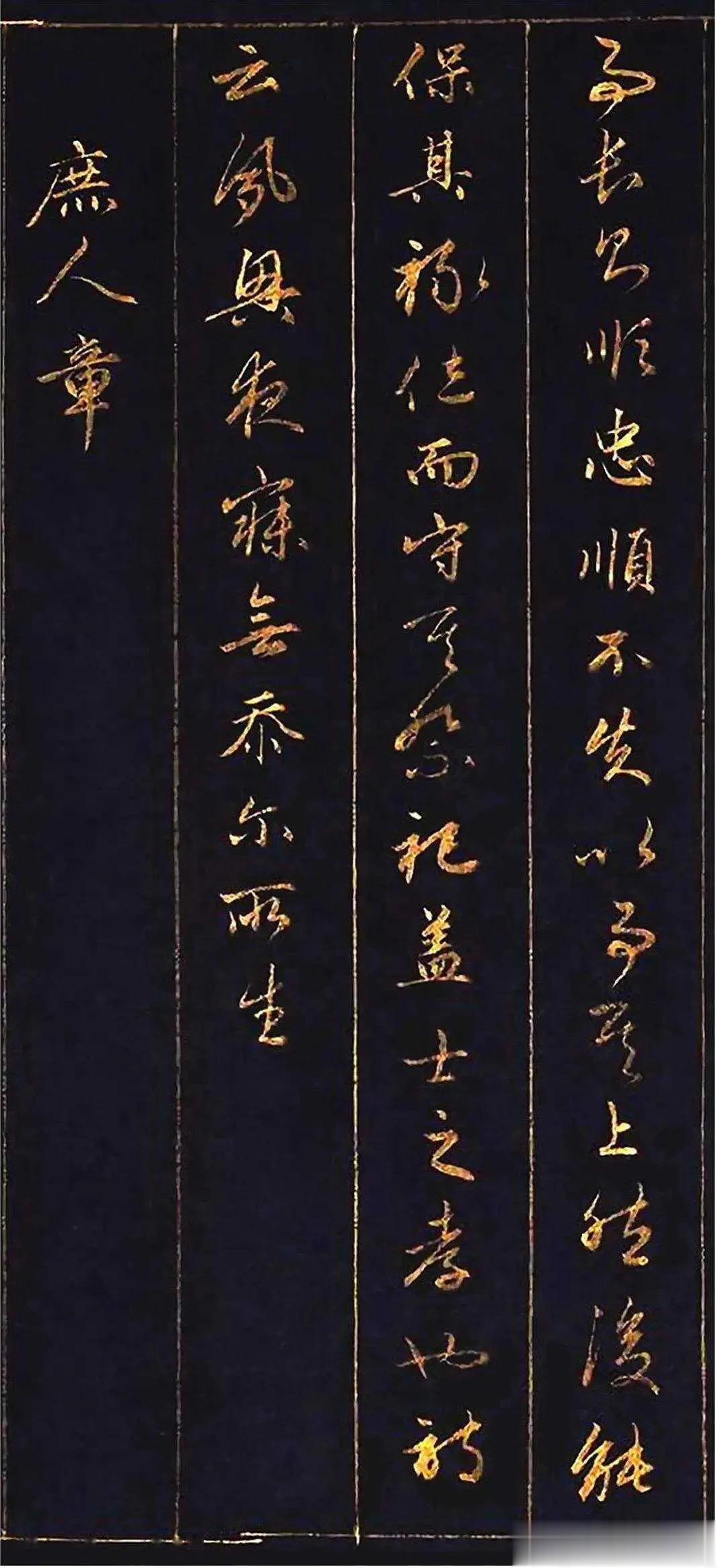 赵孟頫金书《孝经》18章,最动人的是乌楮墨底与金粉的相衬——金粉凝润匀净,既无浮艳刺目之弊,又裹着雅贵的哑光质感,落笔处浓淡随笔锋提按自然晕化。