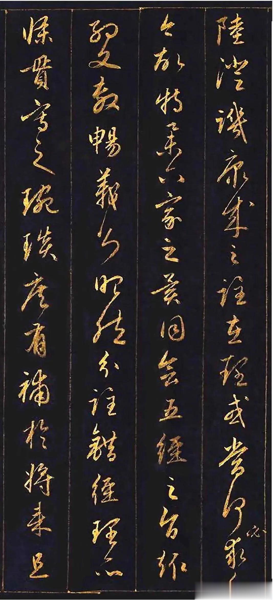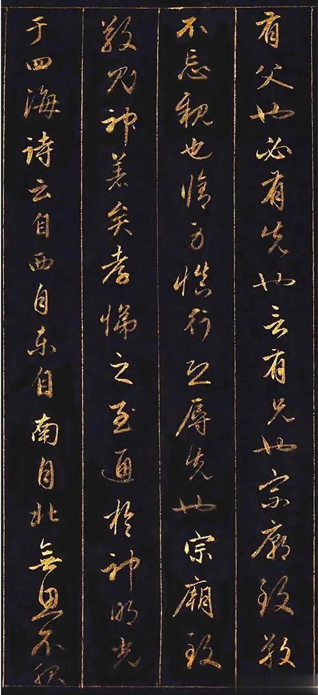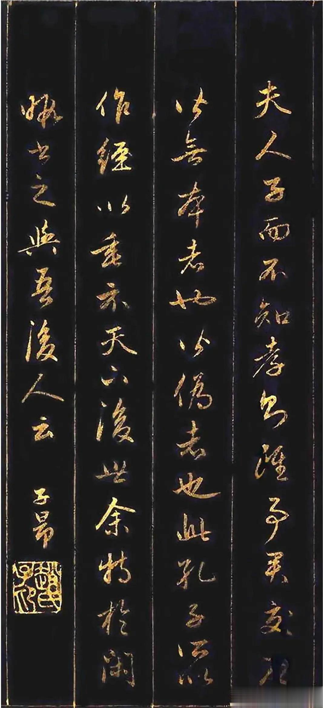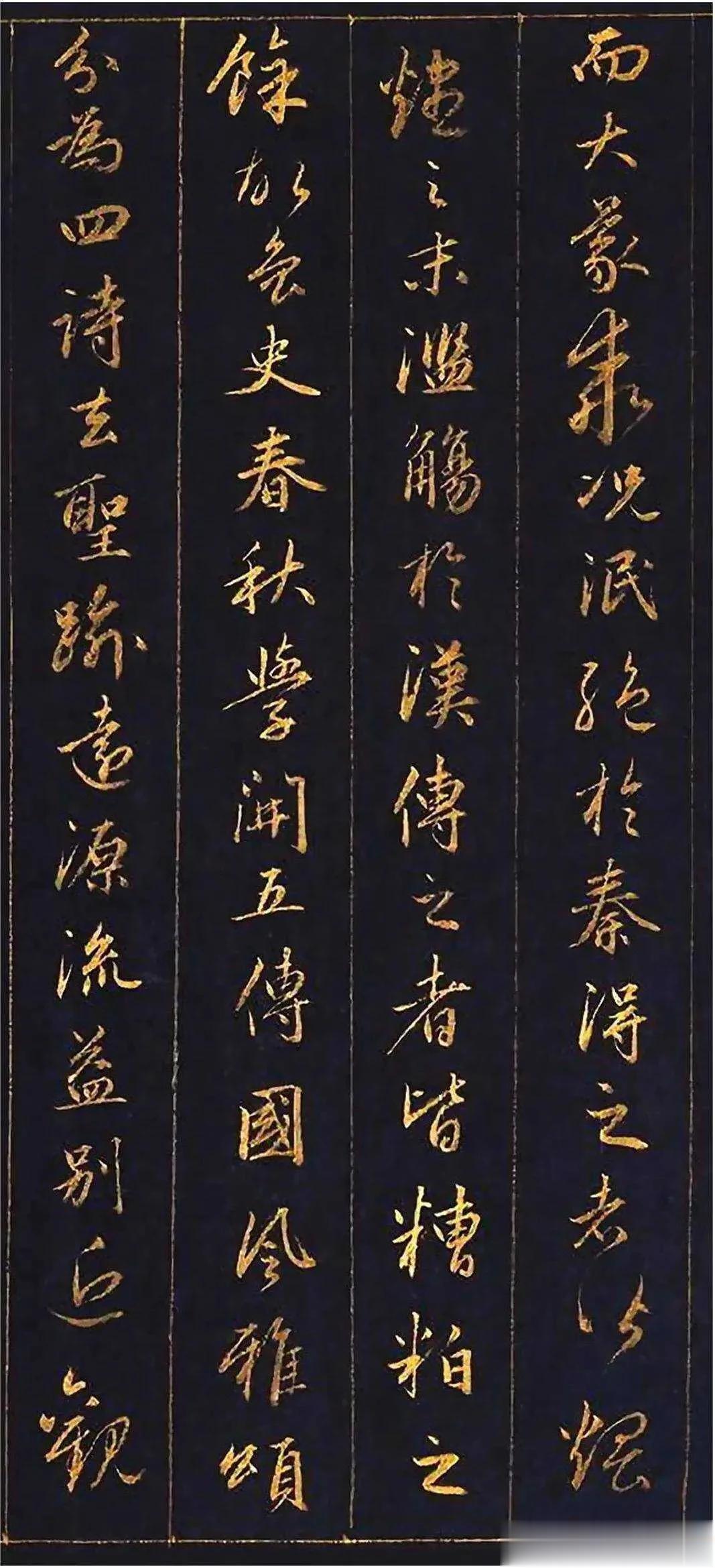 赵孟頫金书《孝经》18章,最动人的是乌楮墨底与金粉的相衬——金粉凝润匀净,既无浮艳刺目之弊,又裹着雅贵的哑光质感,落笔处浓淡随笔锋提按自然晕化。