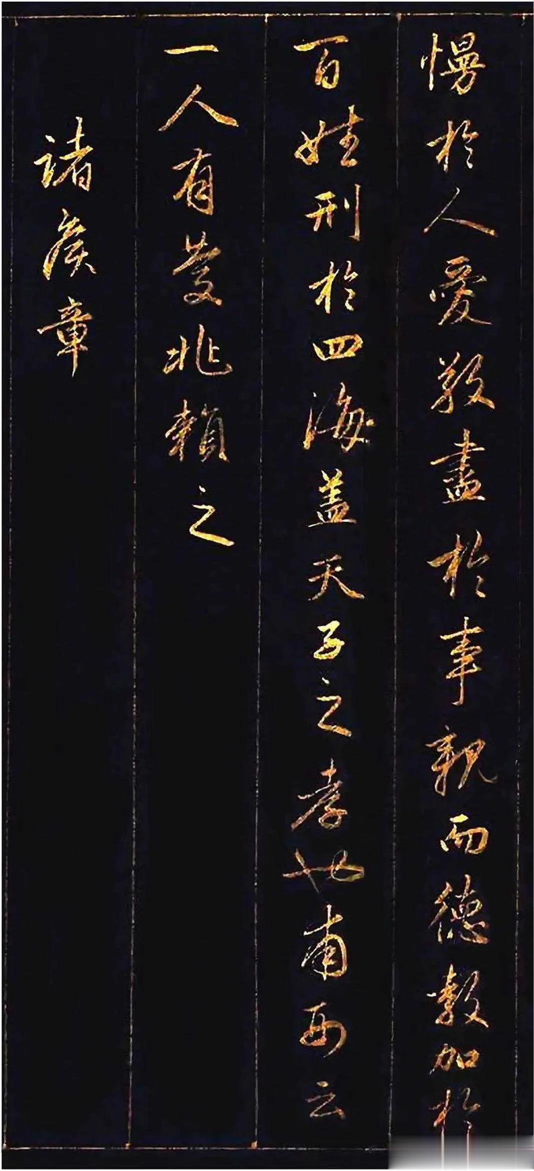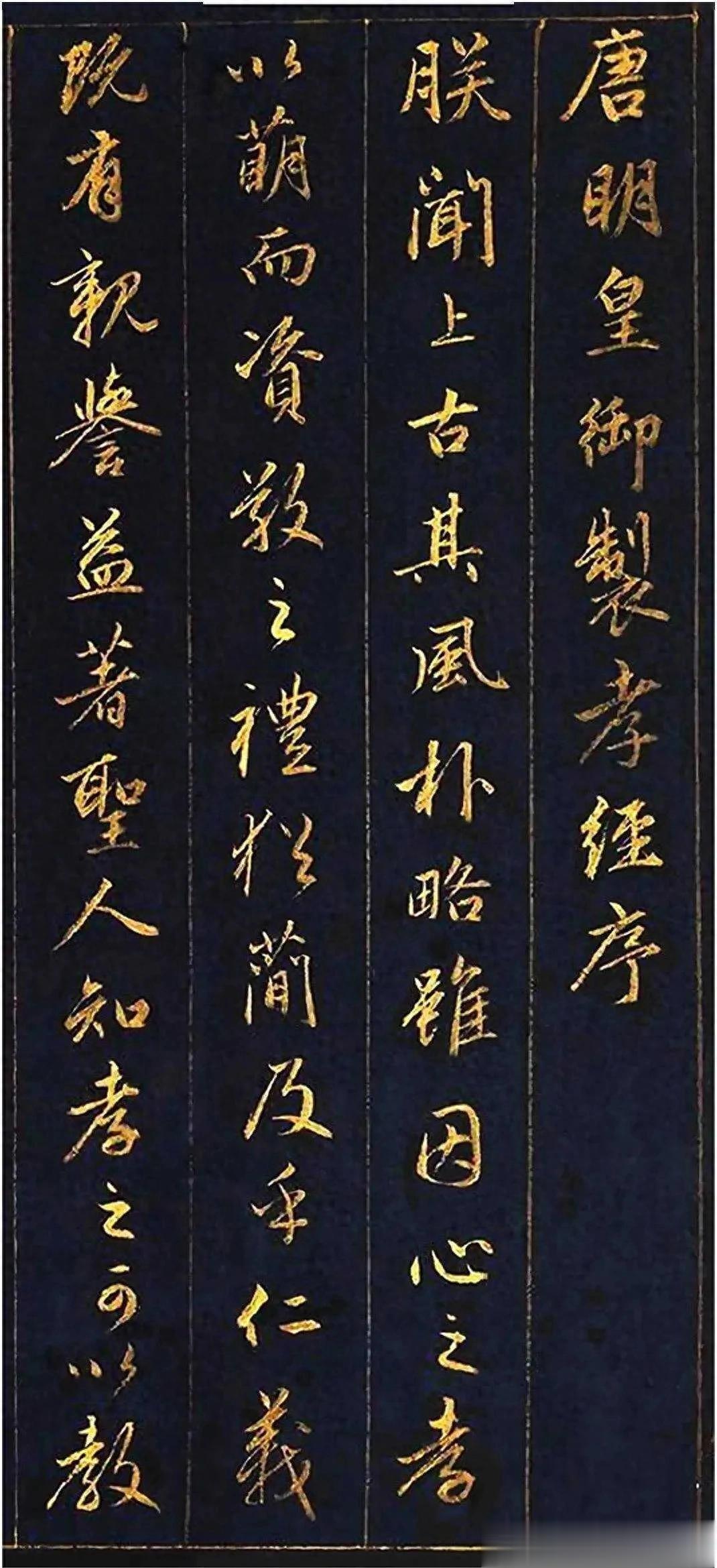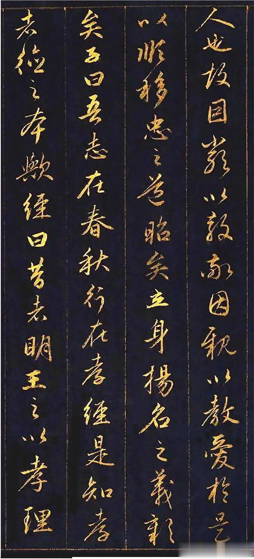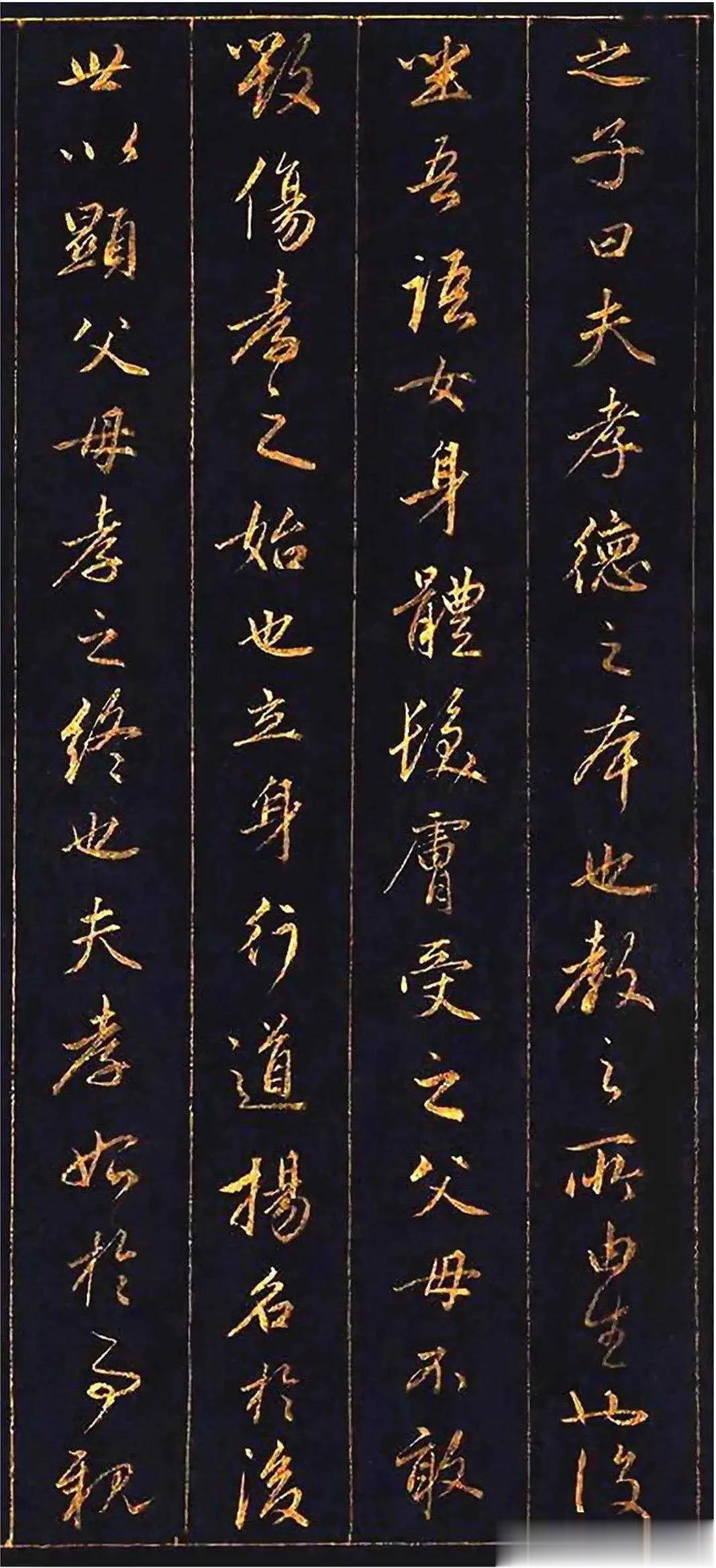 金粉的明丽并非炫技,反让“孝为德本”的庄重多了层可触的雅韵:墨底沉敛压得住金的亮,金粉鲜活托得起书的柔,书艺、经典与材质之美相融,成了“以贵器载至理”的范本。