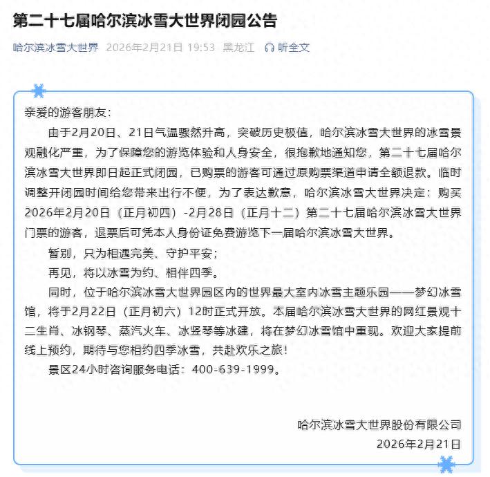 由于2月20日、21日气温骤然升高,突破历史极值,哈尔滨冰雪大世界的冰雪景观融化严重,为了保障您的游览体验和人身安全,很抱歉地通知您,第二十七届哈尔滨冰雪大世界即日起正式闭园,已购票的游客可通过原购票渠道申请全额退款。临时调整开闭园时间给您带来出行不便,为了表达歉意,哈尔滨冰雪大世界决定:购买2026年2月20日(正月初四)-2月28日(正月十二)第二十七届哈尔滨冰雪大世界门票的游客,退票后可凭本人身份证免费游览下一届哈尔滨冰雪大世界。