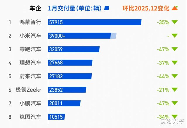 排在第一位的是鸿蒙智行,总共售出5.7万辆,基数很大,但是环比依旧是下滑了35%。