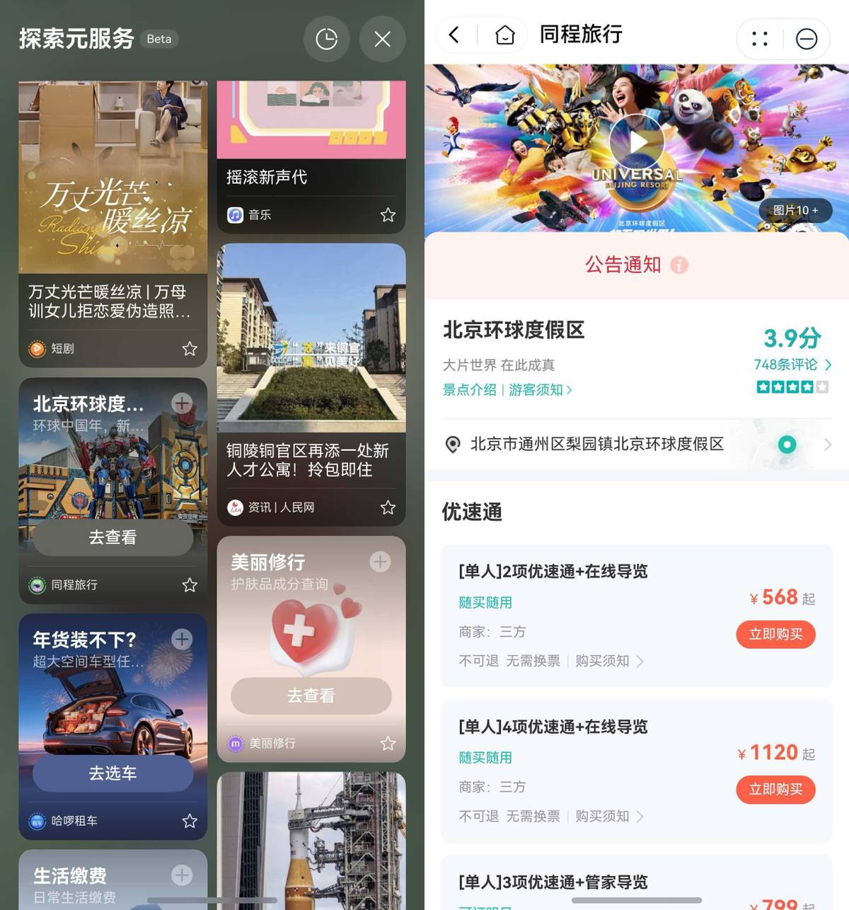 说起这次环球之行,其实一开始我压根没想着冲,还是在探索元服务上刷到了同程旅行的元服务卡片,推荐了环球影城,我点进去发现价格香到戳我,立马拉着朋友敲定死定下了行程,只能说大数据诚不欺我。