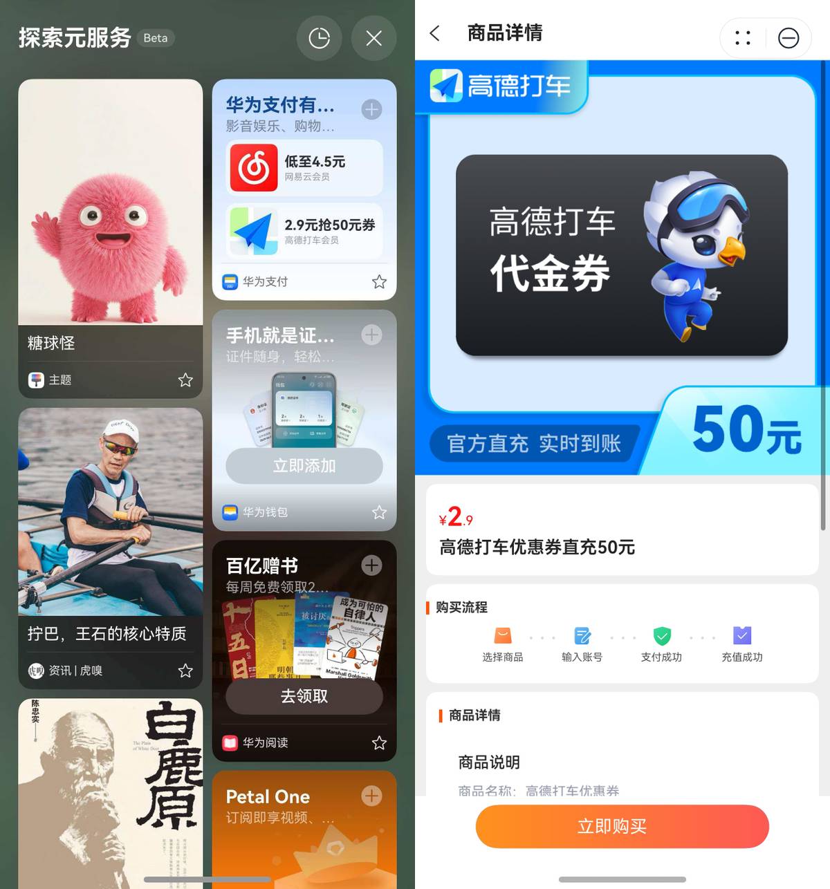 走到路边打车时,我早就在探索元服务上的华为支付卡片里,花2.9元捡漏了高德打车的50元券包。这样一来,当天来回打车直接省出一杯奶茶钱,血赚不亏。当然,它的羊毛可不止这些,偶尔还会有4.5元的网易云会员,薅羊毛星人速速码住。