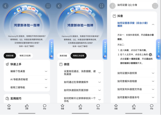 除了直接提问,玩机助手对话页面下方还有个“鸿蒙一指禅”模块,把很多常见的系统功能和常用应用的操作,都整理成细致的操作教程。闲下来翻一翻,还是能学到不少实用技巧的。
