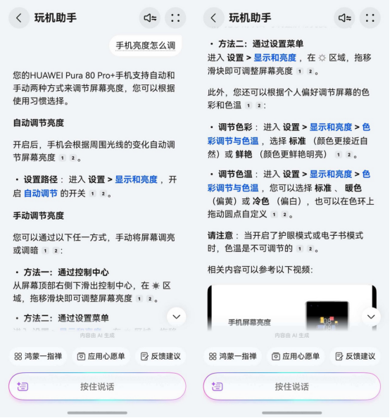 点进去,直接就能和「玩机助手」对话。比如,老妈问:“手机亮度怎么调”,玩机助手立刻给出清晰的步骤,一步一步告诉她该怎么做,很贴心的是,指引里的关键设置选项会标成蓝色,一点就能直接跳转对应设置页面,完全不用担心“找不着,点错地方”。老妈试了一次,开心地说:“原来这么简单,以后我自己就能搞定了”。